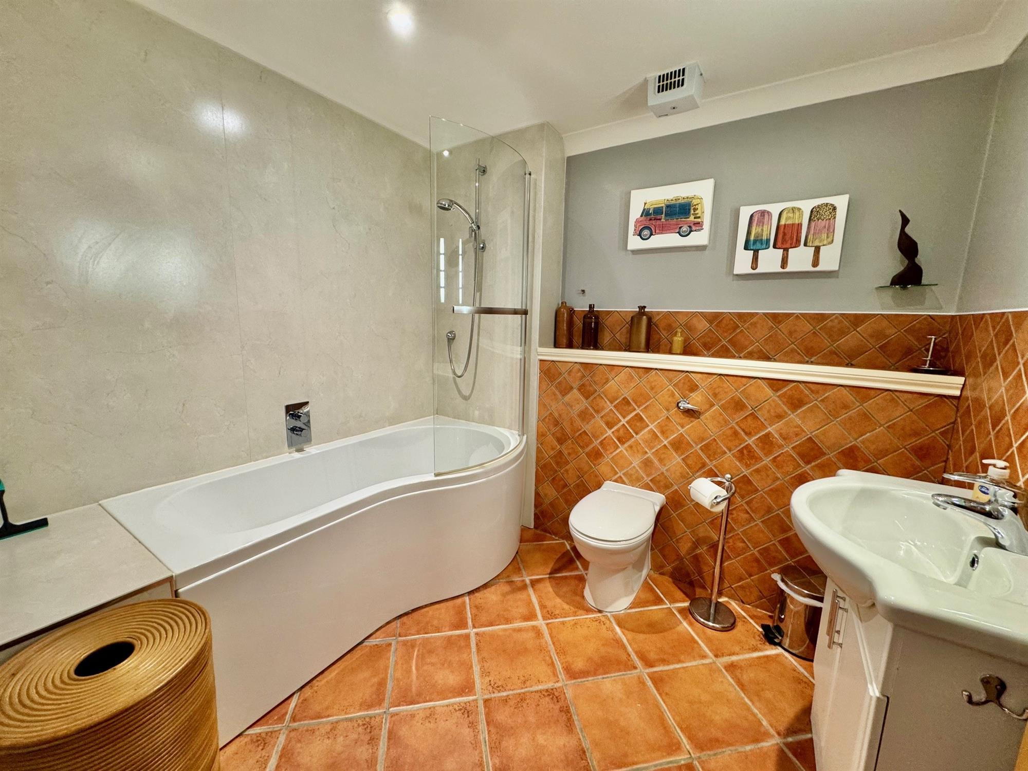 Generous bathroom with a white suite comprising 'P' shaped bath with built-in shower over and curved glass screen. Enclosed flush low level W.C. Wash hand basin with mixer tap and tiled splashback, with cupboards under. White runged radiator. Extractor fan. Coved ceiling. Downlighters. Tiled floor. Feature glass block wall.