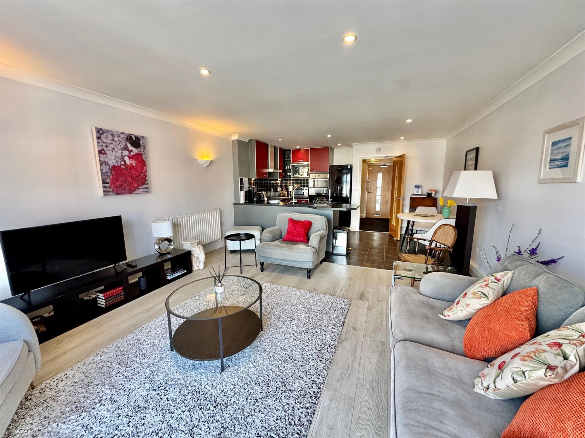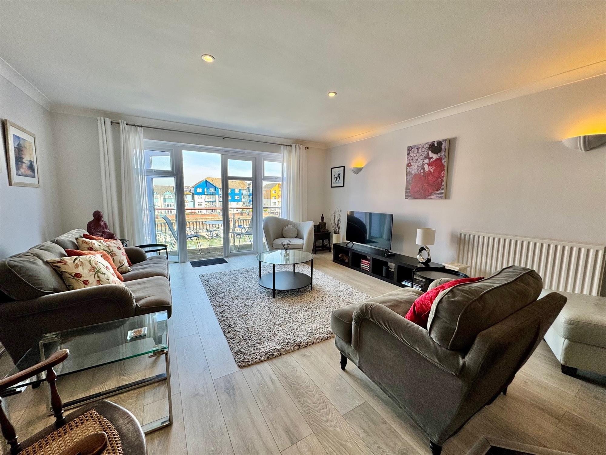 Open plan to the kitchen, divided by a breakfast bar. The spacious sitting area has large double glazed windows and doors with wonderful views over the marina, leading out onto the full-width balcony with a glass and stainless steel balustrade, again with great views over the marina. Laminate flooring. Coved ceiling. Downlighters. Radiator.