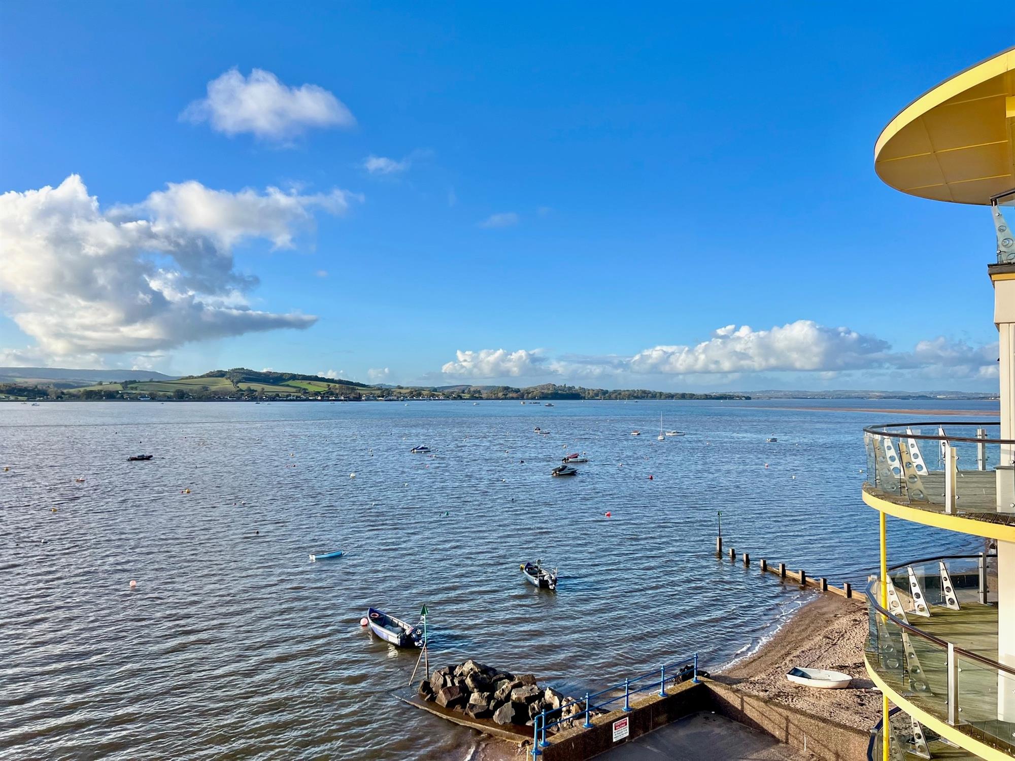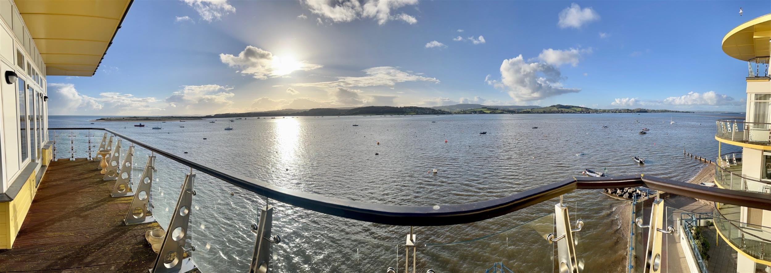 OUTSIDE:LARGE L-SHAPED BALCONY 29' 5" (8.97m) x 12' 1" (3.68m): L-shaped balcony which is particularly large for a property of this type, facing in a South and South-Westerly direction with exceptional 180 degree views towards the sea, Dawlish Warren, Haldon Hills and Exe Estuary.
