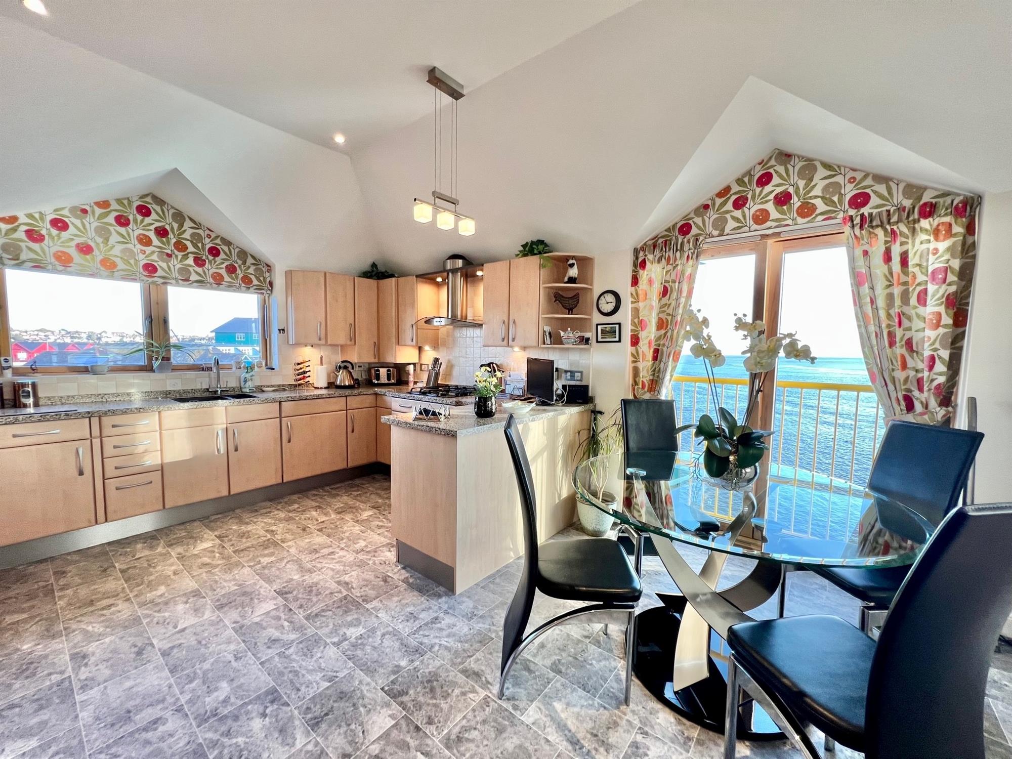 KITCHEN BREAKFAST ROOM: 17' (5.18m) x 12' 2" (3.71m): Double glazed double doors with views towards the sea and a double glazed window with Marina glimpses. Stone worktop surfaces with matching upstands with one and a half bowl stainless steel sink with mixer tap and groove drainer. Four ring gas hob. Cupboards and drawers under with integrated oven, microwave, fridge, freezer, dishwasher and washing machine. Matching wall mounted cupboards and display shelving. Stainless steel and glass cooker hood. Kick-space heater.