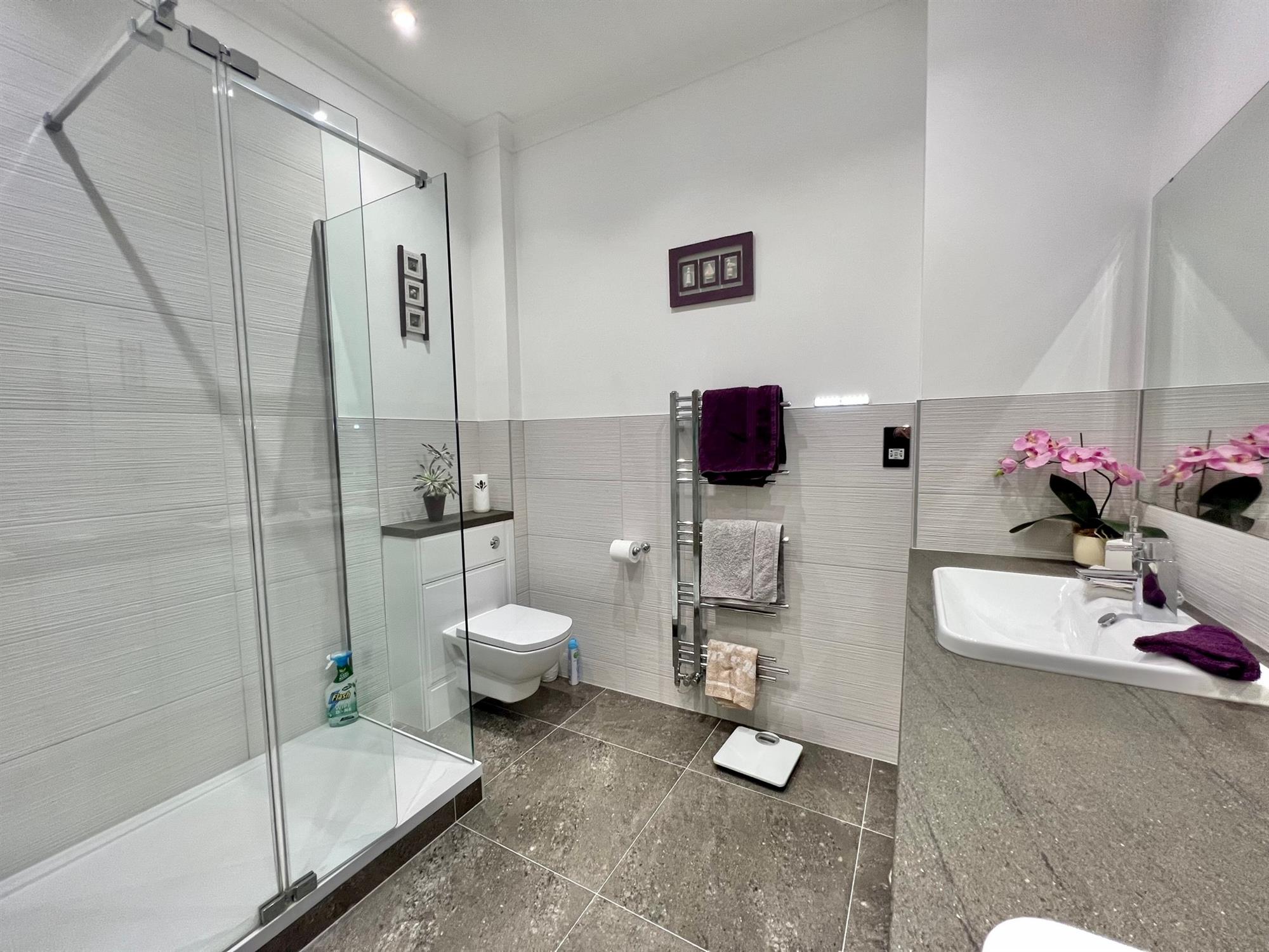 EN-SUITE: Recently refitted comprising a large walk-in shower cubicle with glass surround and twin headed shower unit in full tiled surround. Enclosed flush low level WC. Twin wash hand basins with storage under, tiled splashback and vanity mirror. Coved ceiling. Downlighters. Chrome runged radiator. Extractor fan.