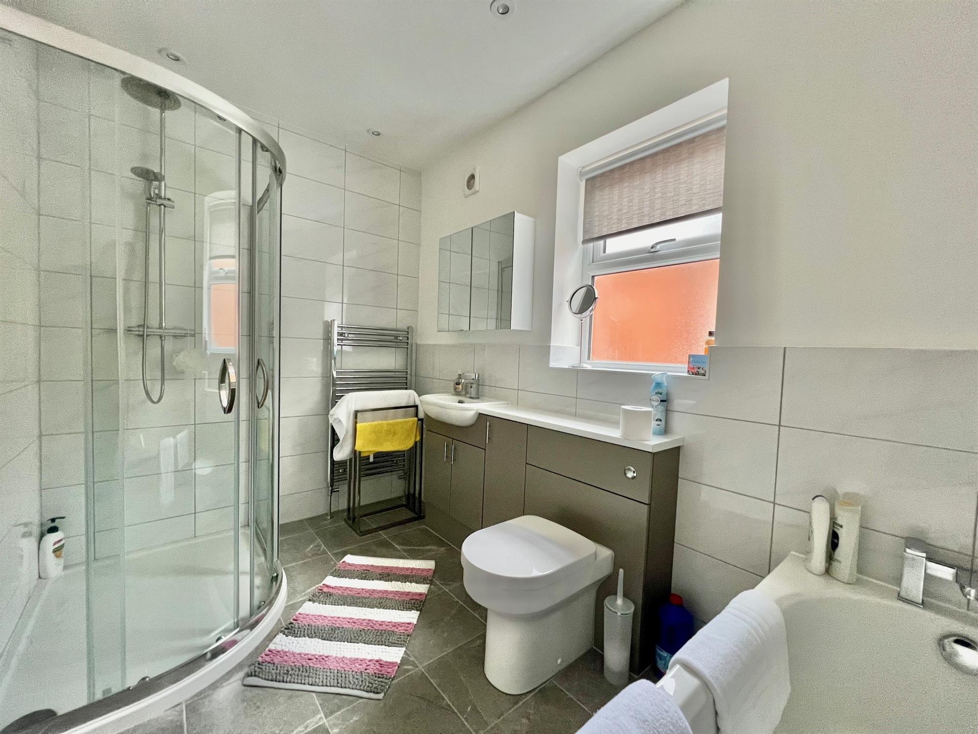 10' 1" (3.07m) x 6' 2" (1.88m): Modern white suite comprising panelled bath with mixer tap in tiled surround. Enclosed flush low level WC. Wash hand basin with mixer tap and cupboards under. Oversized fully tiled corner shower cubicle with built-in twin headed shower. Mirrored medicine cabinet. Extractor fan. Downlighters. Chrome runged radiator. Tiled floor. Opaque double glazed window to the side.