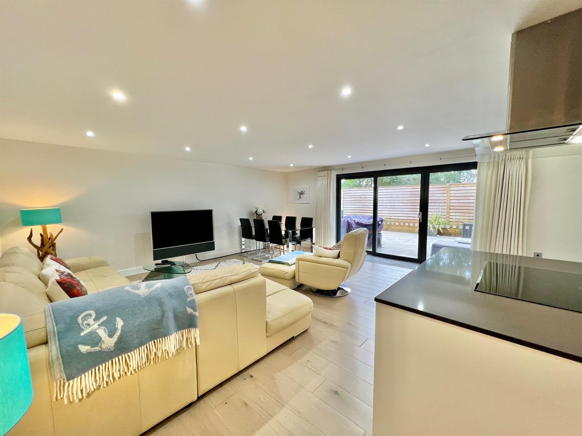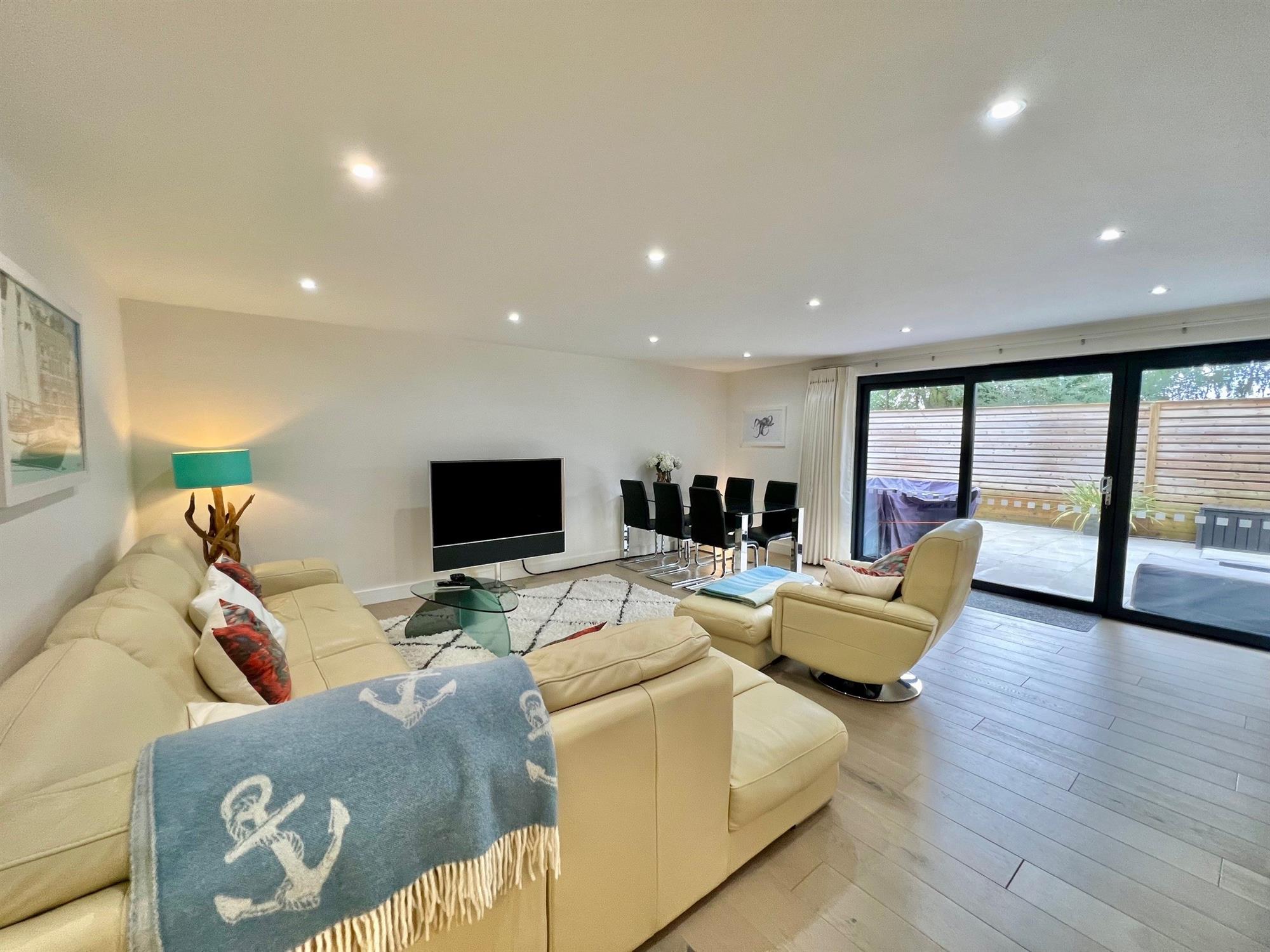 SITTING / DINING AREA with downlighters, double glazed windows and sliding double glazed doors leading out onto the rear garden, all with underfloor heating.