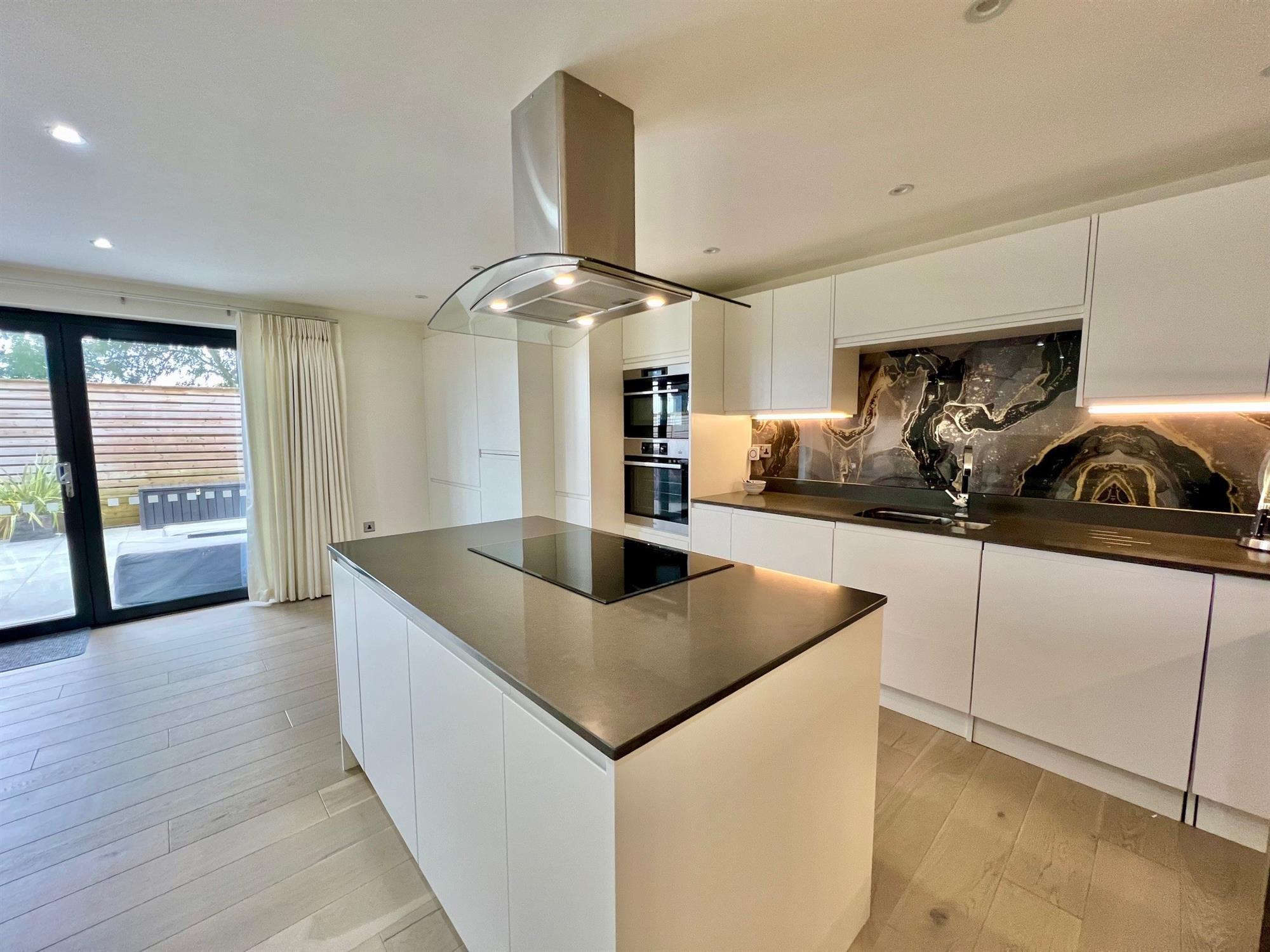 OPEN PLAN KITCHEN / DINING / SITTING ROOM23' 9" (7.24m) x 18' 9" (5.71m): The kitchen area has polished stone worktop surfaces with matching upstands with undermount one and a half bowl sink with grooved drainer and mixer tap. Ample cupboard and drawer storage with integrated wine fridge, dishwasher, washer dryer, fridge freezer, AEG oven and combination oven. Matching wall mounted cupboards with underlighting. Matching breakfast bar with cupboards and drawers under with built-in AEG five ring induction hob with glass and stainless steel extractor over. Cupboard concealing gas fired combi boiler. Wood flooring which continues through to the open plan