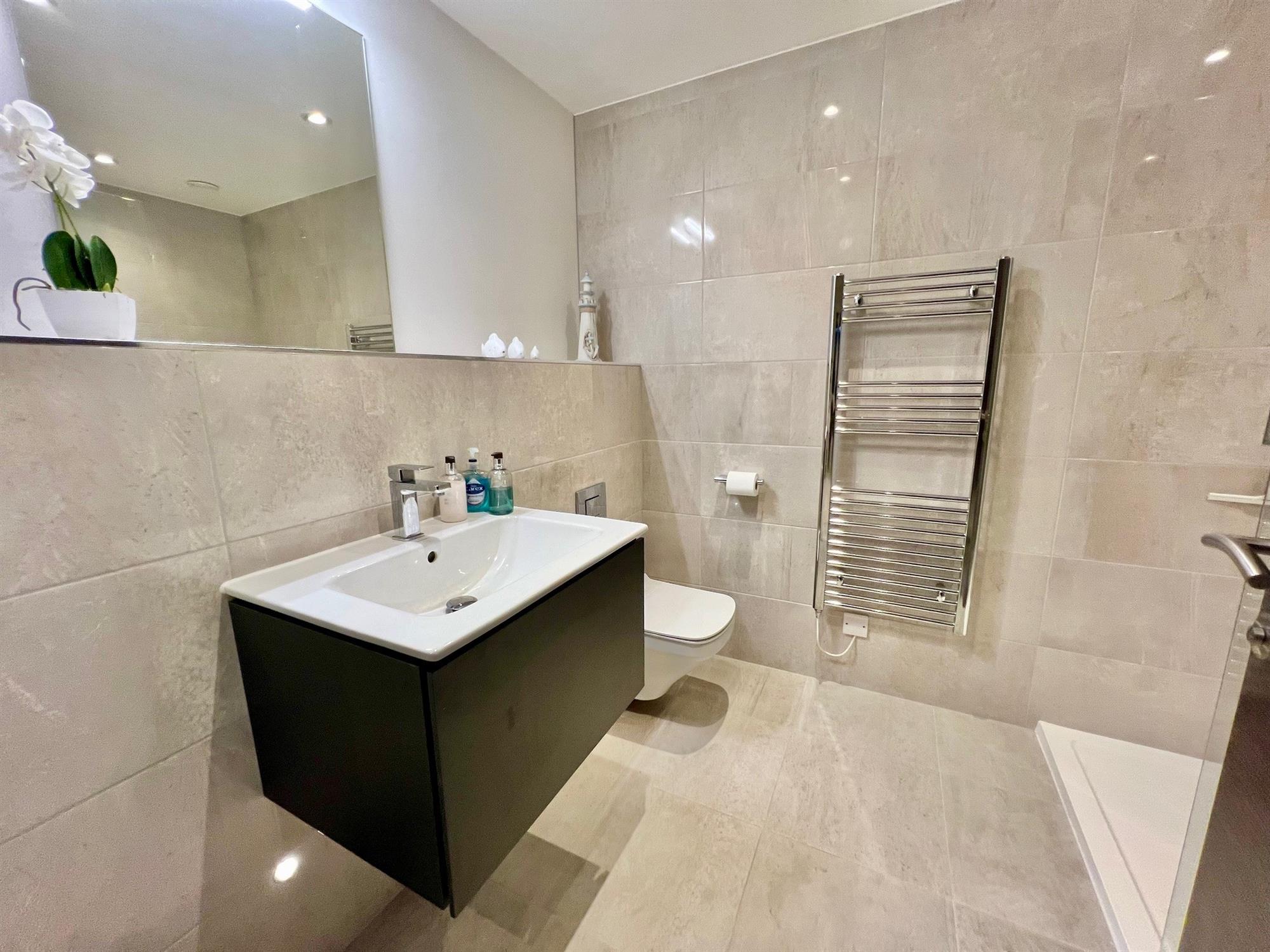 EN-SUITE8' 5" (2.57m) x 6' 5" (1.96m): White suite comprising large walk-in shower cubicle in full tiled surround with rain head shower and handheld shower with a glass screen. Wall hung WC in tiled surround. Wall hung wash hand basin with cupboard under and mixer tap in tiled splashback. Courtesy vanity mirror with light above. Shaver point. Motion dectector lighting. Heated chrome runged radiator. Downlighters. Extractor fan.