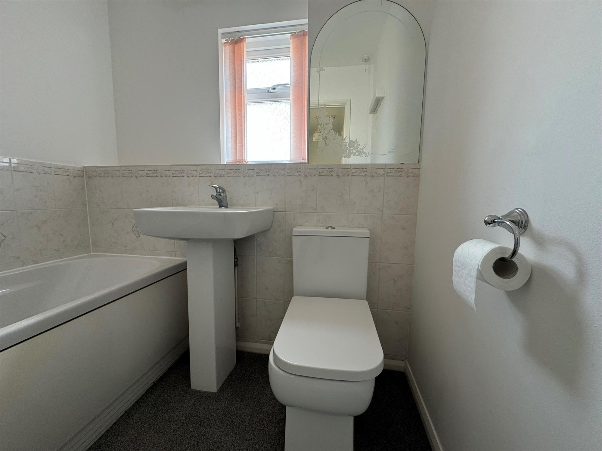 BATHROOM 9' 3" (2.82m) x 8' 9" (2.67m): Modern white suite comprising panelled bath in tiled splashback with mixer shower tap. Pedestal wash hand basin with mixer tap. Low level WC. Radiator. Opaque double glazed window to side. Extractor fan. Light with shaver point.