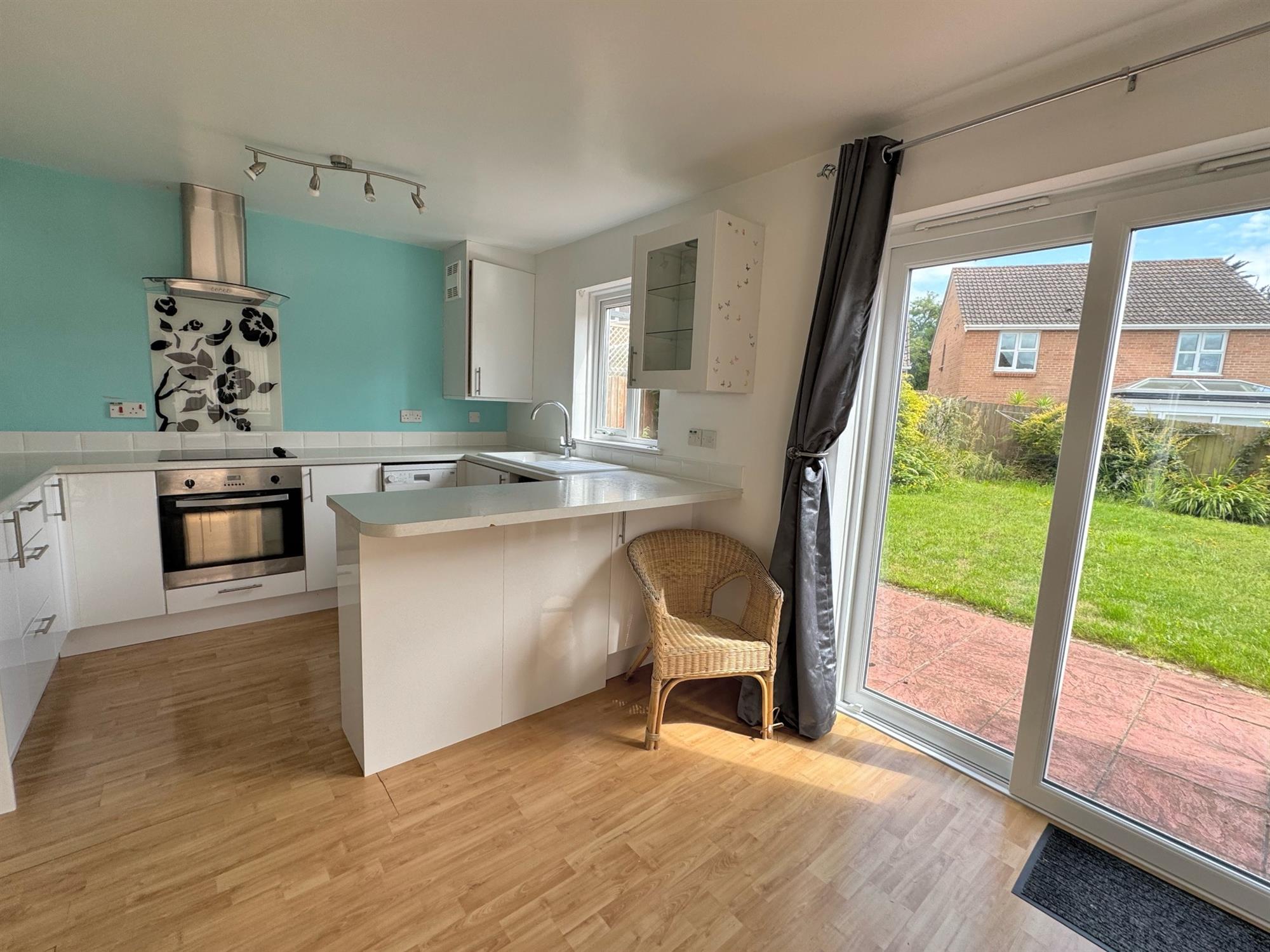 KITCHEN BREAKFAST ROOM15' 6" (4.72m) x 10' (3.05m): Worktop surfaces in tiled splashback with inset ceramic hob with oven under. White sink with drainer and mixer tap. Cupboards and drawers under with space for dishwasher, washing machine and fridge freezer. Matching wall mounted cupboards. Corner wall mounted cupboard concealing the gas fired boiler. Double glazed window to the rear. Laminate wood flooring. Double glazed sliding doors to the rear. Radiator. Built-in understairs cupboard. Double glazed sliding doors leading through to the...