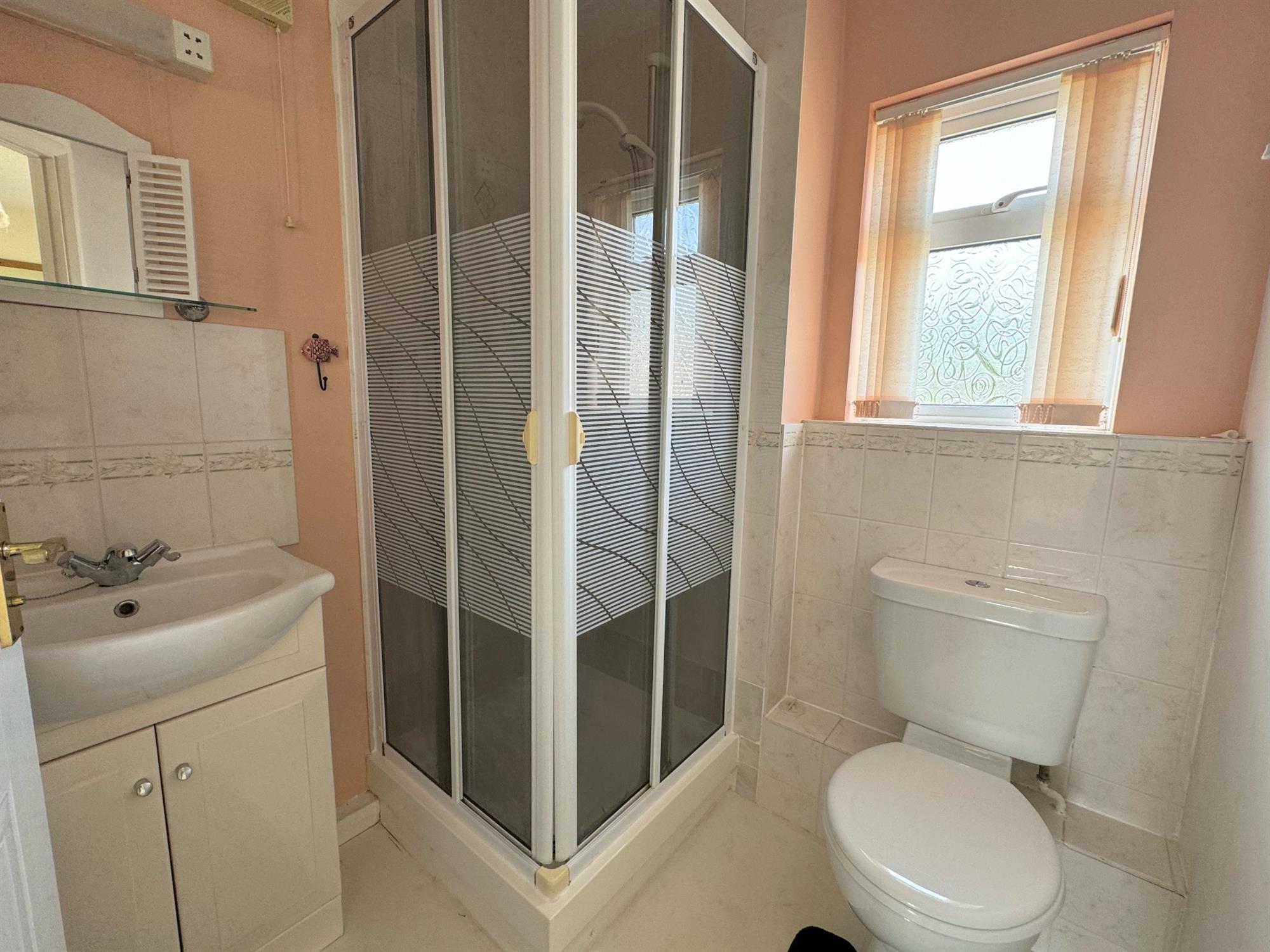 EN-SUITE6' 1" (1.85m) x 5' 10" (1.78m): Corner shower cubicle in full tiled surround with electric shower. Low level WC. Wash hand basin with mixer tap in tiled splashback with cupboards under. Radiator. Extractor fan. Light with shaver point. Electric heater. Opaque double glazed window to the front.