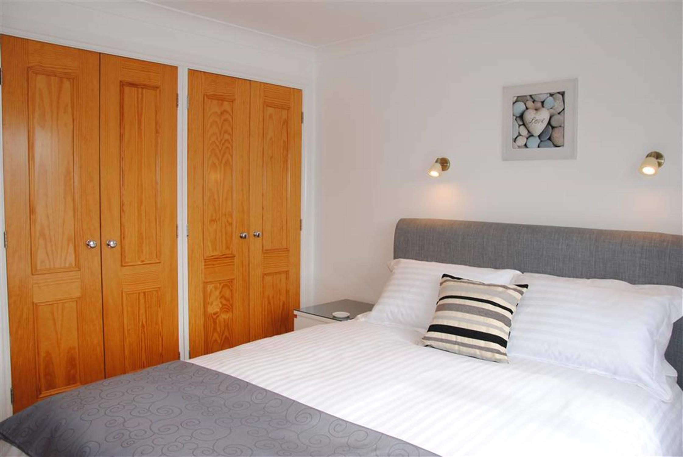 MASTER BEDROOM 10'7 (3.22m) x 10'4 (3.15m)uPVC double glazed window enjoying a superb outlook over the Marina with estuary and coastline views beyond. Radiator. Television point. Built-in double wardrobes with clothes rail and shelving. Recessed ceiling spot lights and additional wall lights.