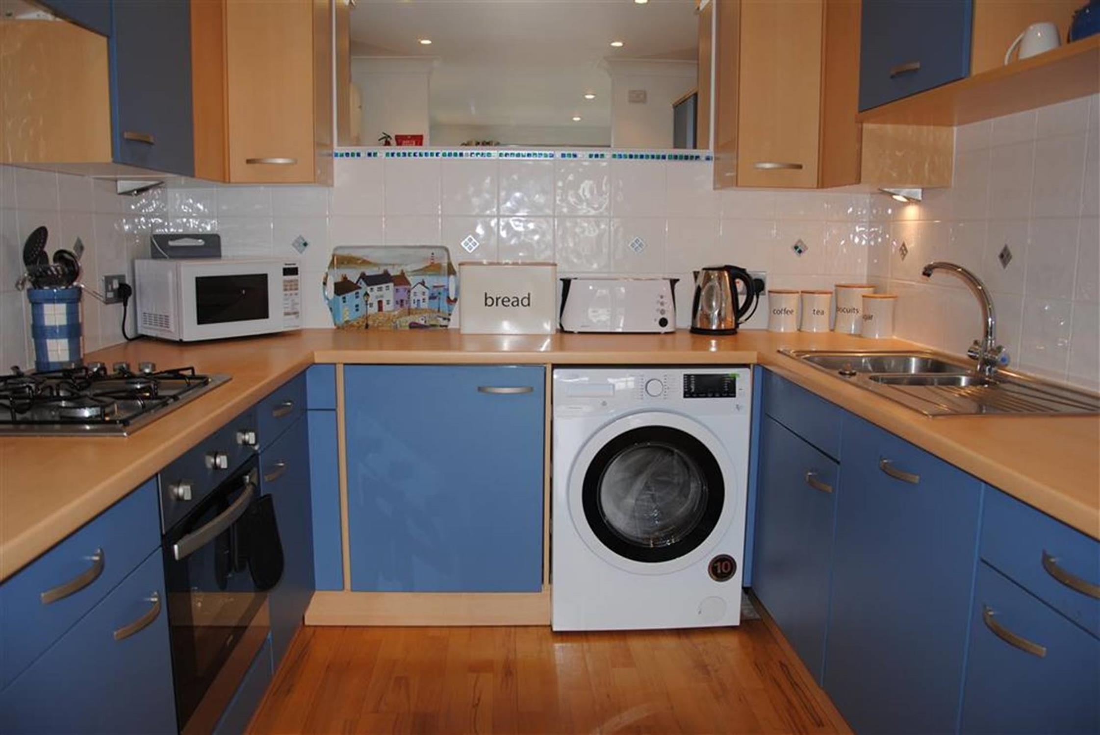 KITCHEN 8'4 (2.54m) x 7'10 (2.39m)Modern fitted kitchen with wood effect work top surfaces. Inset stainless steel 1½ bowl single drainer sink unit with mixer tap. Range of cupboards and drawers. Dishwasher. Plumbing for washing machine. Inset four ring gas hob with extractor hood over and built-in oven below. Matching cupboards at eye level with concealed lighting beneath. Attractive wall tiles. Recessed ceiling spot lights. Worcester gas boiler serving domestic hot water and central heating. Solid wood engineered flooring.