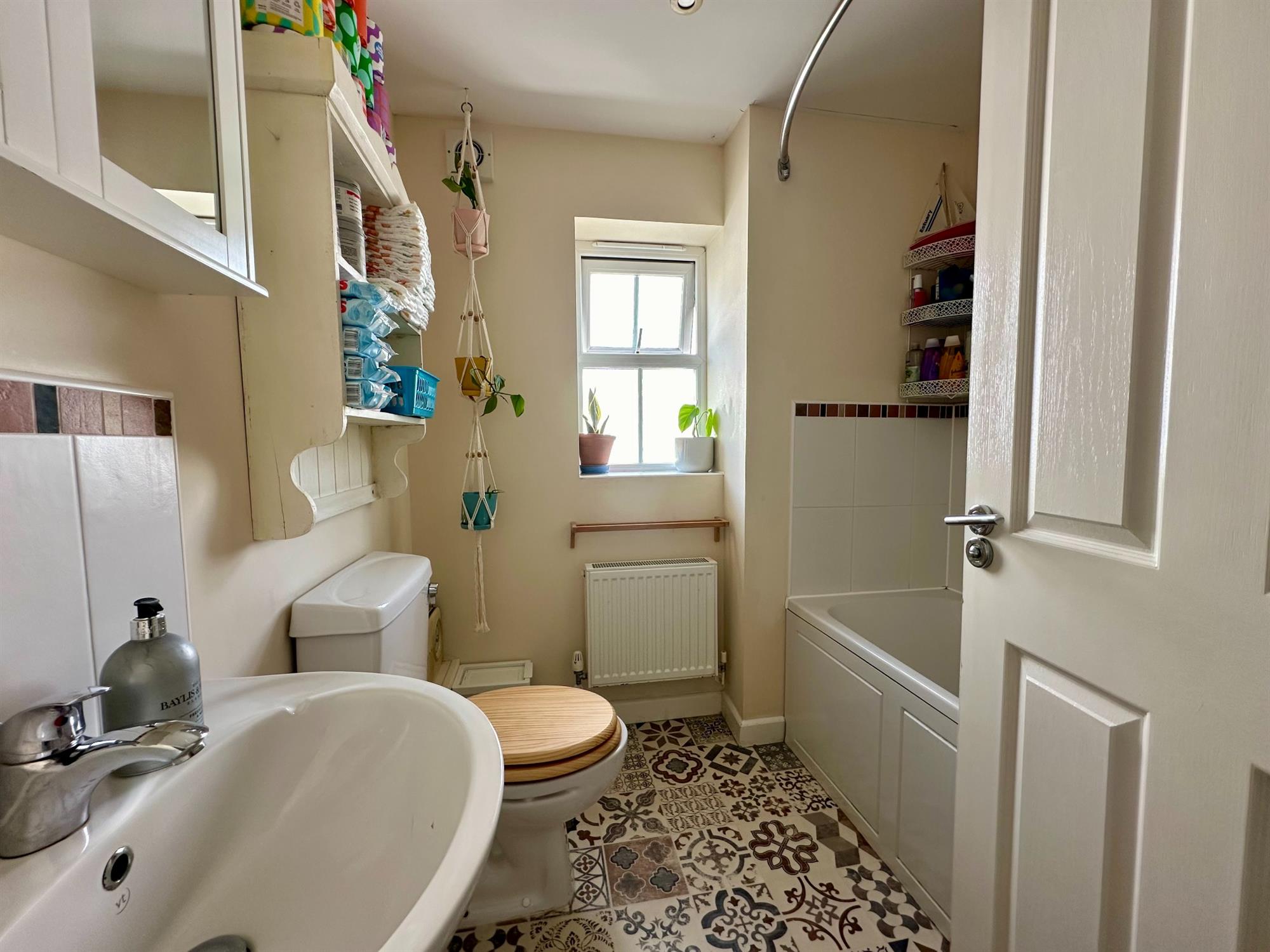 FAMILY BATHROOMThe family bathroom has been fitted with a white W.C and hand basin, along with a bath with mixer shower over, and the room has been finished with range white wall tiles with decorative mosaic borders.