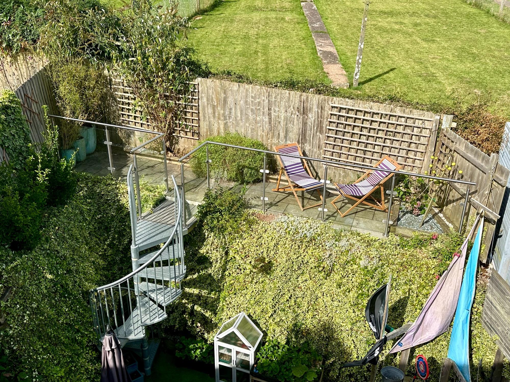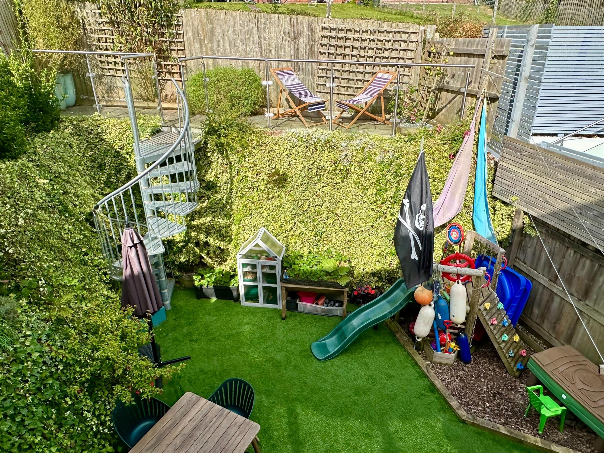 GARDENThe secluded rear garden has central lawn laid with treated, practical artificial grass with the surrounding banks filled with flowering plants. A clever spiral staircase leads up to a second tiered garden which has been beautifully planted and offers a magnificent elevated platform.