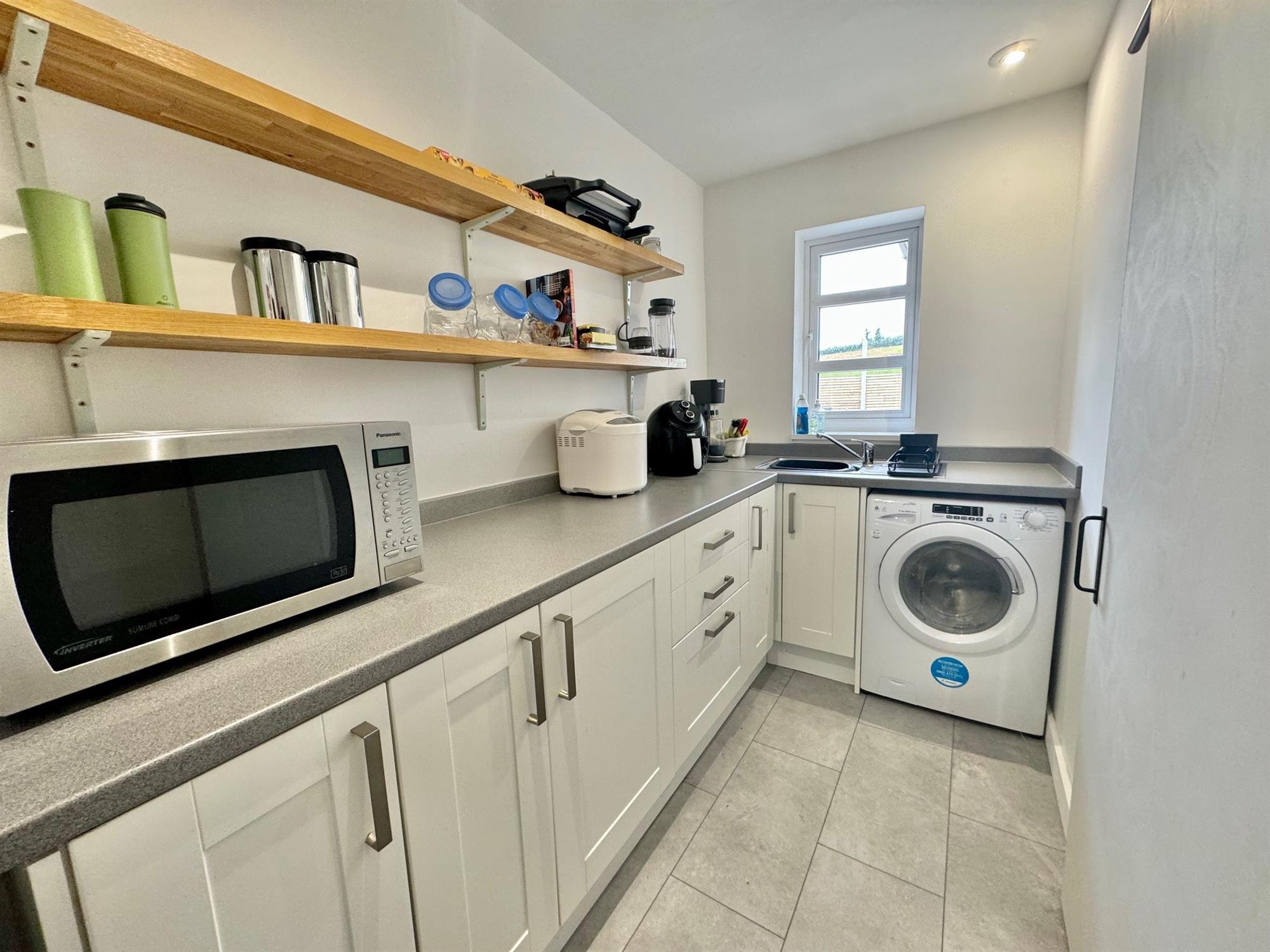 UTILITY ROOM11' (3.35m) x 5' 1" (1.55m): Roll edge worktop surface with matching up-stand. Stainless steel sink with drainer and mixer tap. Space for washing machine. Cupboards and drawers under. Space for fridge freezer. Wall mounted Oak shelving. Triple glazed window to rear. Radiator. Tiled effect floor. Downlighters. Extractor fan.