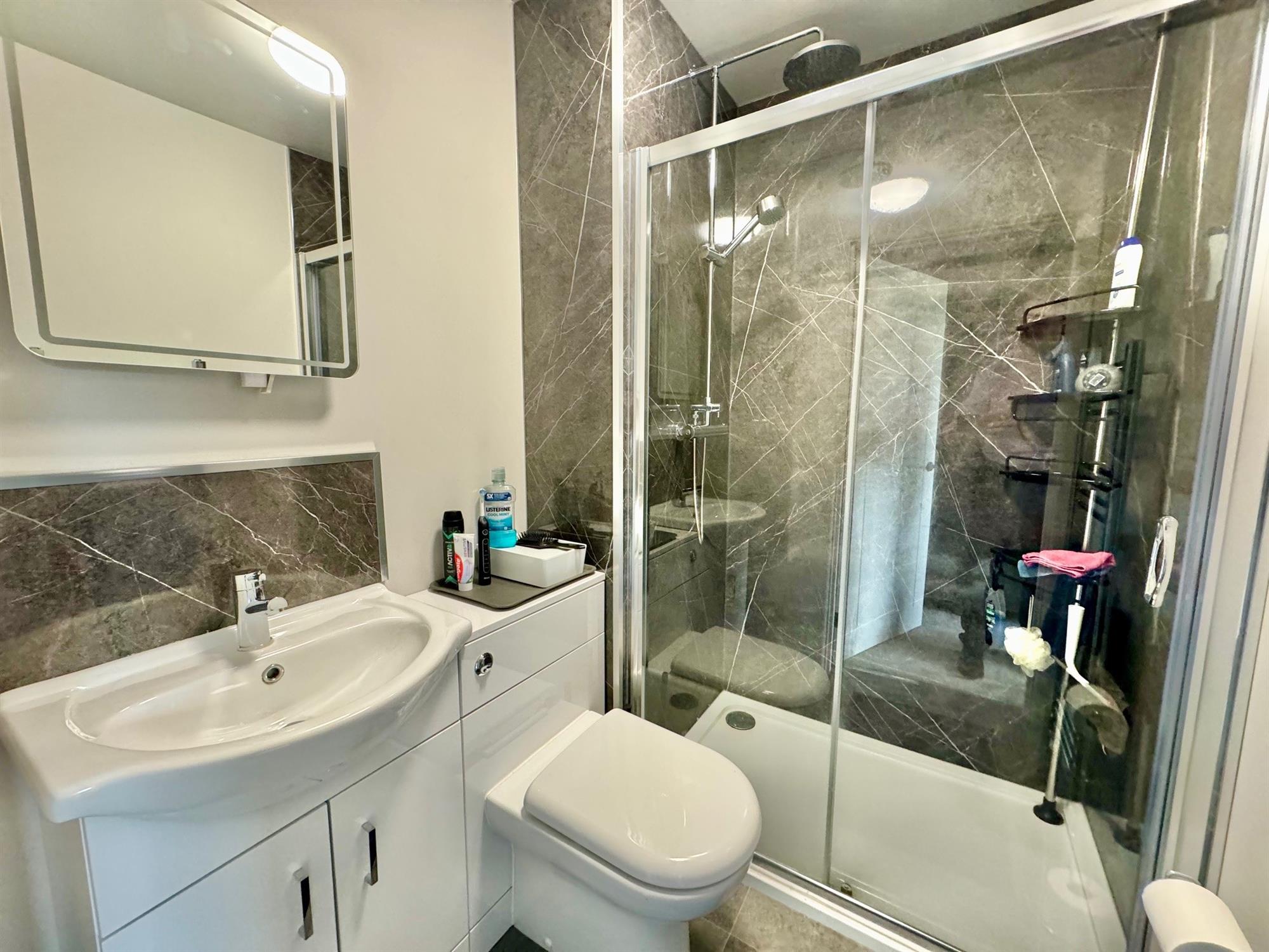 Modern white suite comprising oversized walk-in shower cubicle with glass sliding door and built-in twin head shower. Enclosed flush WC. Wash hand basin with mixer tap and cupboards under. Back-lit mirror. Extractor fan. Chrome runged radiator.