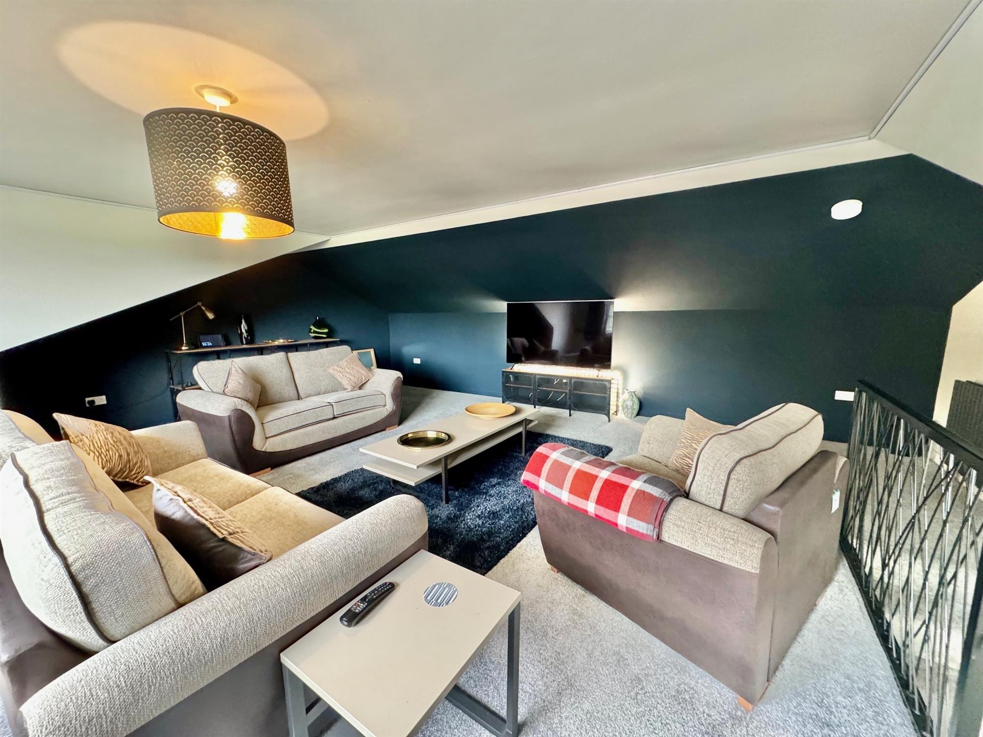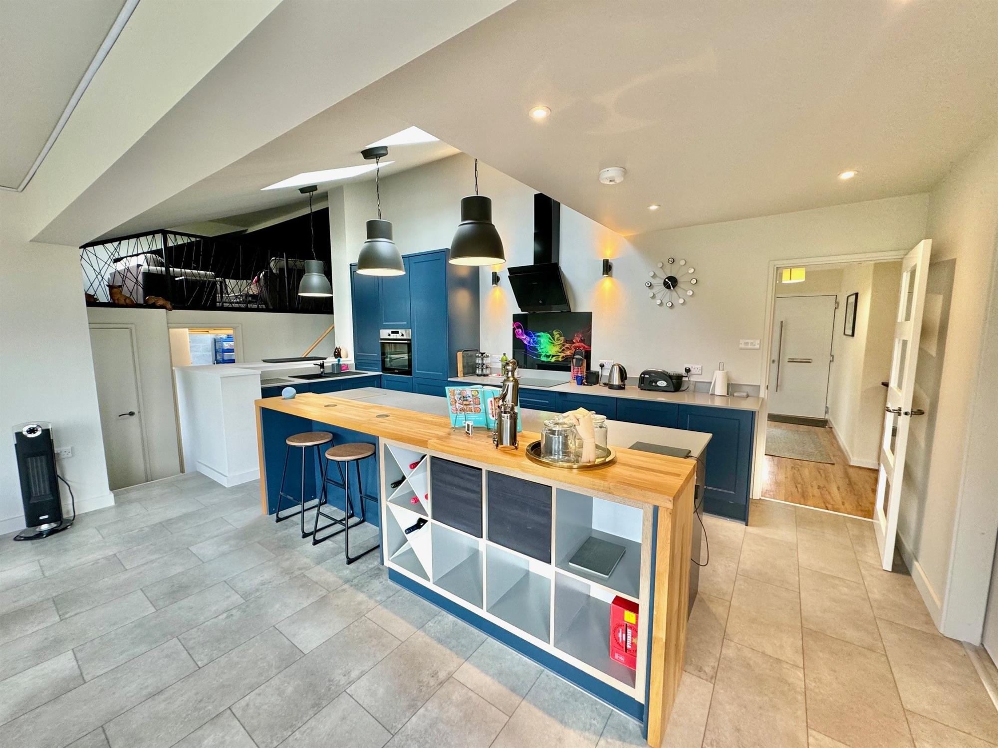 A particularly large bright spacious room. The kitchen area has quartz worktop surfaces with matching up stands. Inset Hotpoint ceramic hob. Inset black sink with drainer and mixer tap. Integrated oven, fridge and dishwasher. Matching wall mounted cupboards. Black glass cooker hood. Downlighters throughout. BREAKFAST BAR has a matching worktop surface with cupboards and drawers under. Raised solid oak breakfast bar with room for 3 stools and further fitted storage. Two triple glazed motorised Velux windows with integral blinds. Tiled effect flooring throughout the whole room.Tall runged radiator.