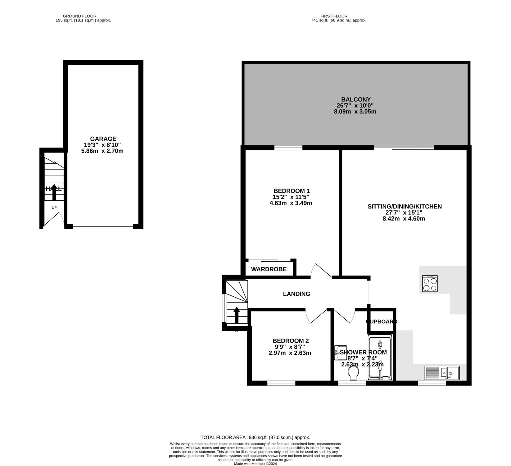 GARAGE19' 3" (5.87m) x 8' 10" (2.69m): Remote controlled roller door, power and light.