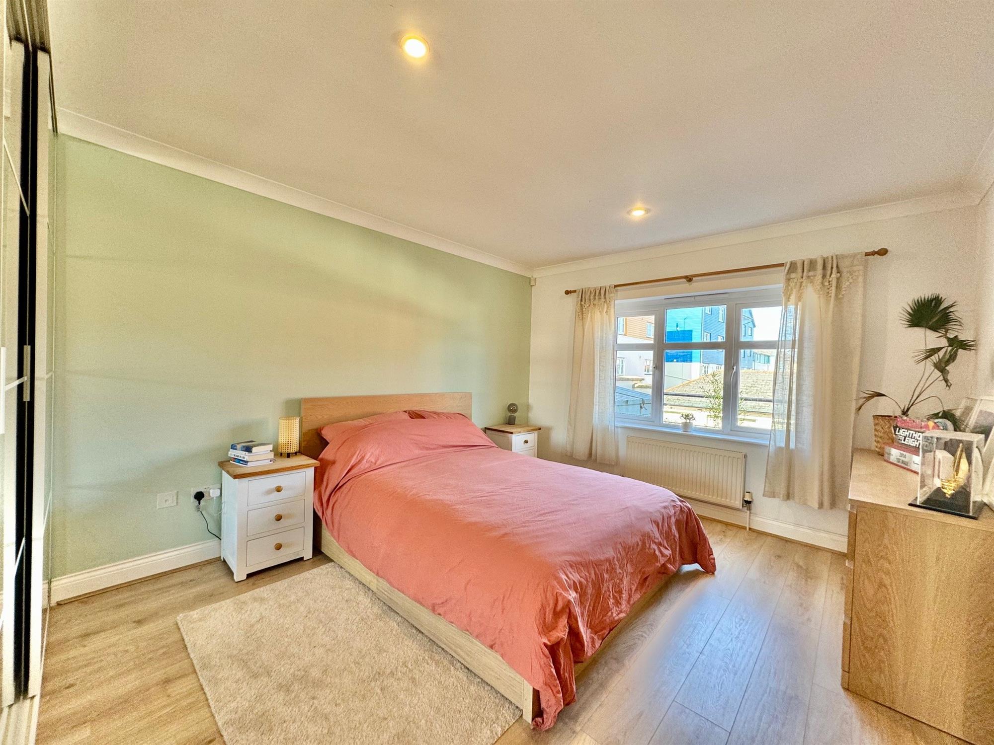 BEDROOM 115' 2" (4.62m) x 11' 5" (3.48m): Double glazed window to rear overlooking the balcony. Coved ceiling. Radiator. Downlighters. Wood effect flooring. Fitted mirrored triple wardrobe.