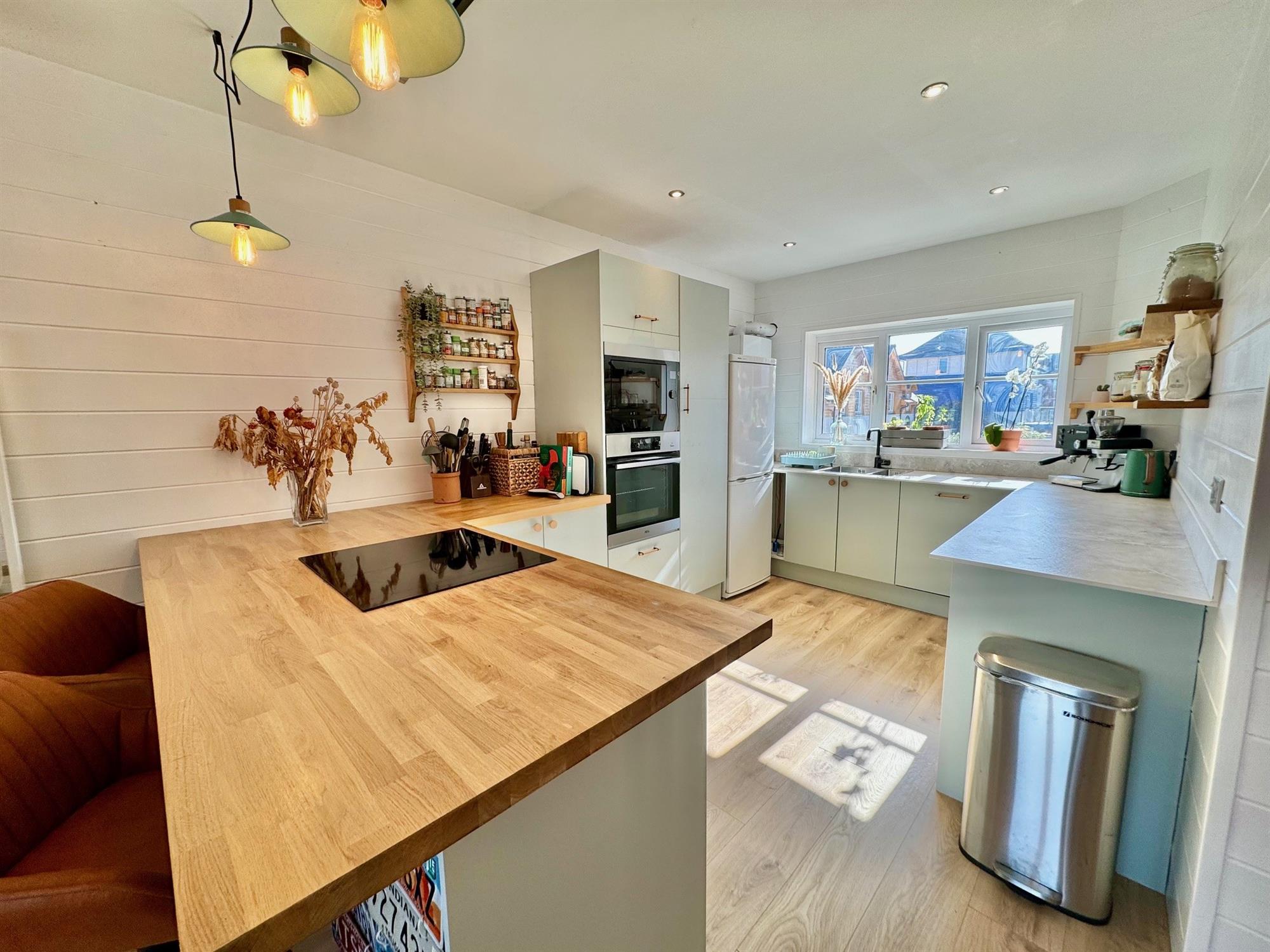 KITCHEN AREA: Modern fitted kitchen with solid wood worktop surfaces with inset AEG four ring electric induction hob. Cupboards and drawers under with integrated dishwasher, oven and microwave. Space for free standing fridge freezer. Continuing worktop surface with matching upstands with inset one and a half bowl sink with mixer tap. Wall mounted Vaillant gas fired combi boiler. Ceiling extractor. Downlighters. Two white runged radiators. Door concealing a