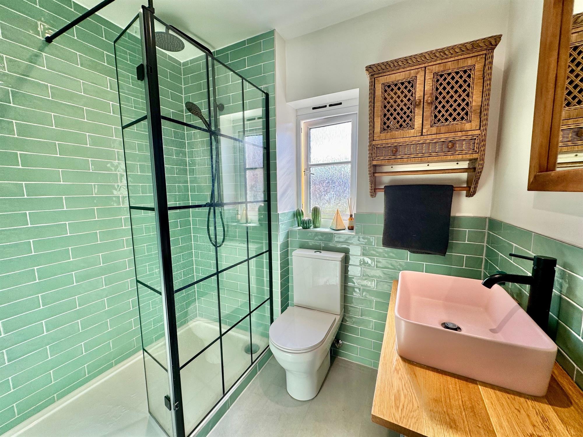 SHOWER ROOM8' 7" (2.62m) x 4' 7" (1.40m): Large walk-in shower cubicle in full tiled surround with twin headed shower with Victorian style glass screen. Low level WC. Wash hand basin with mixer tap set in a vanity top with mixer tap and storage under. Continuing walls in half height tiled surround. Opaque double glazed window. Downlighters. Extractor fan. Black runged radiator.