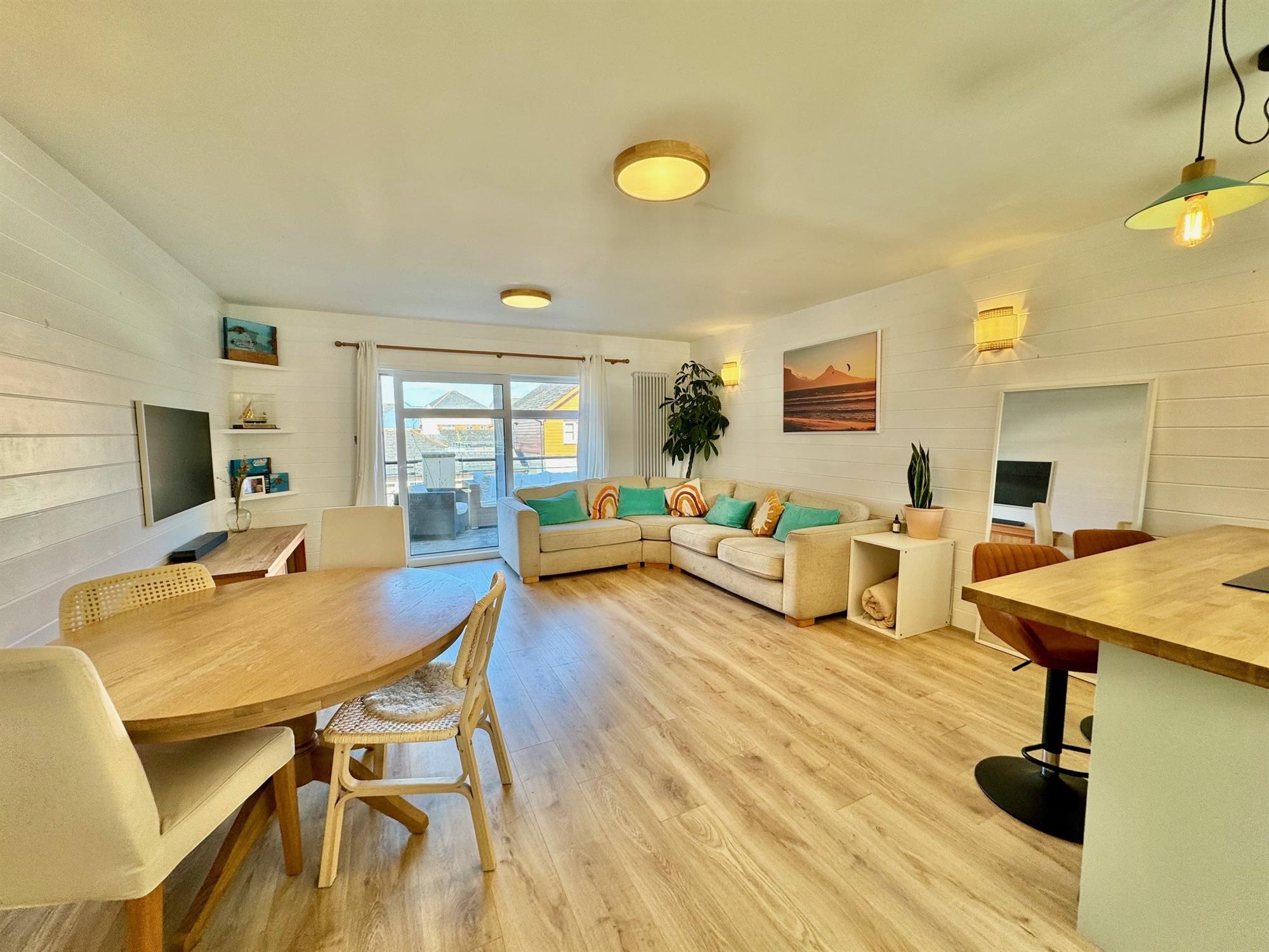 SITTING / DINING AREA: Double glazed window to front and double glazed sliding doors onto the rear balcony. Wood effect flooring throughout. Timber panelled walls.