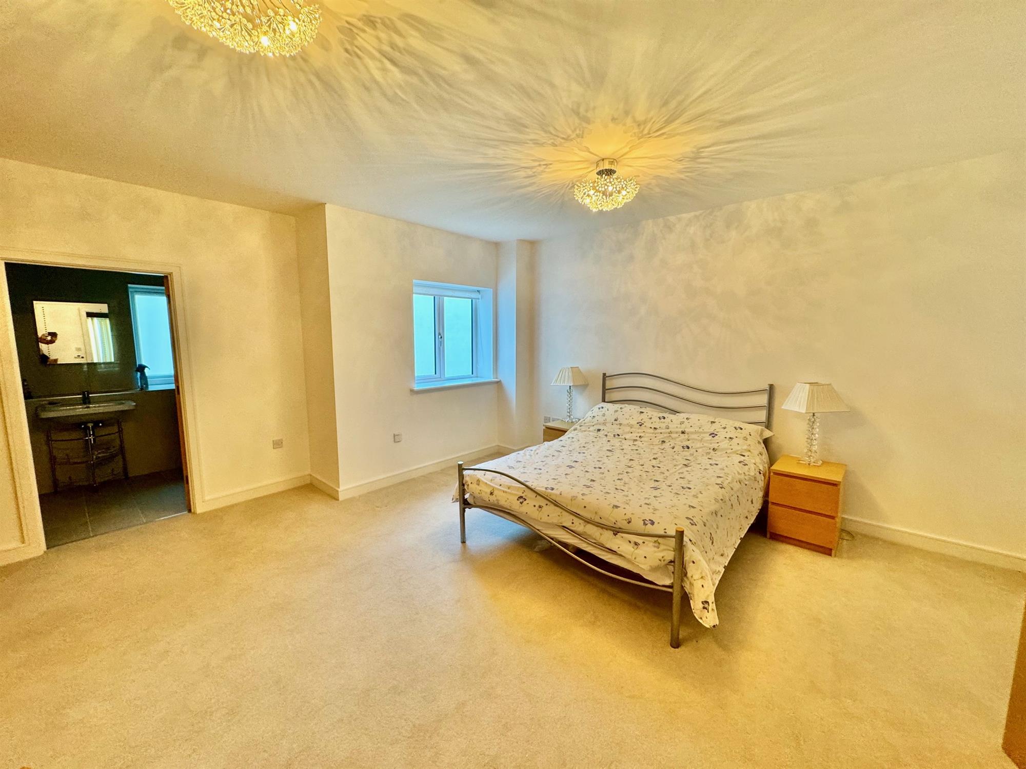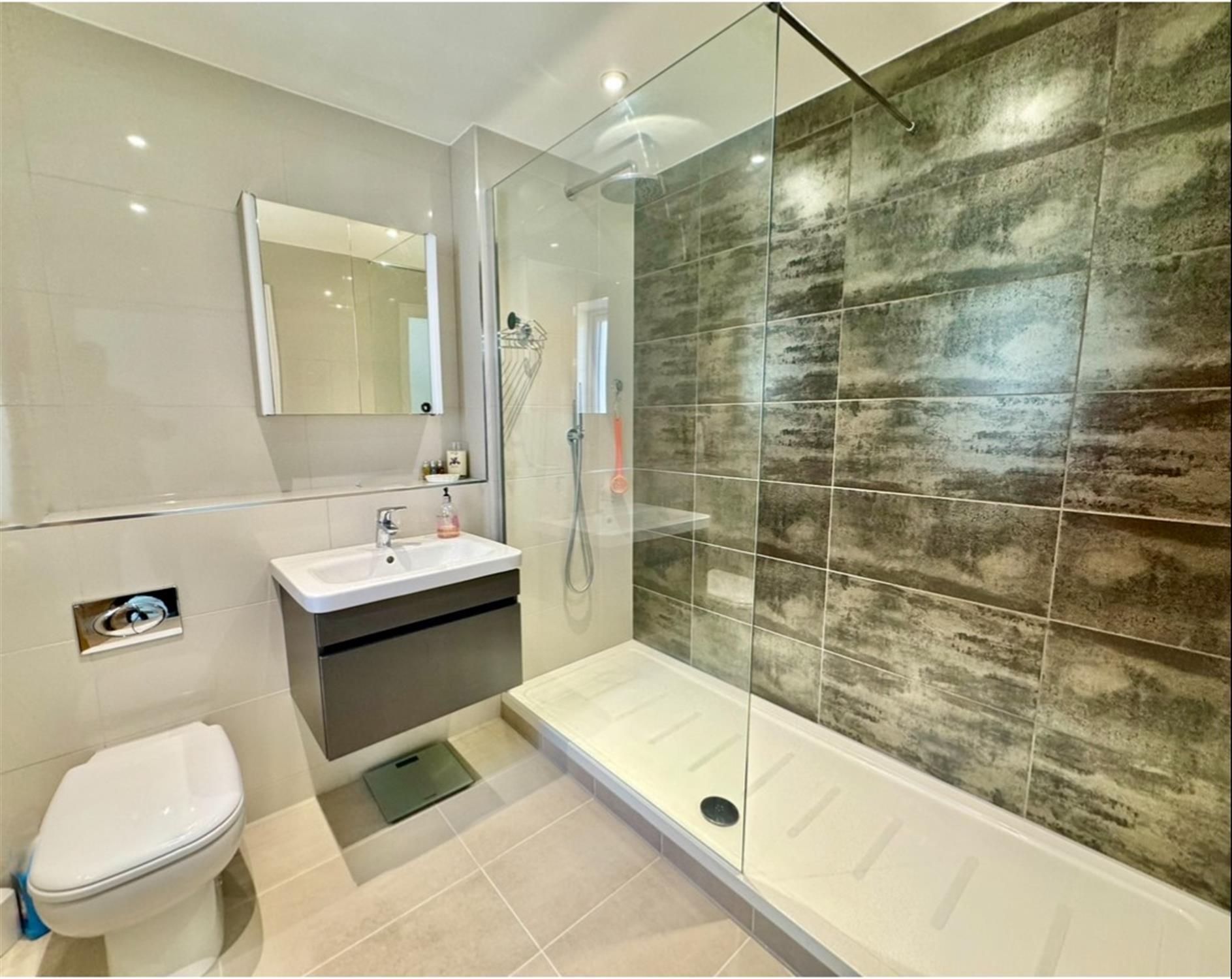 EN-SUITE 7' 9" (2.36m) x 7' 1" (2.16m)Large walk-in double shower cubicle with twin headed shower and glass screen. Low level enclosed flush W.C. Wash hand basin with mixer tap and cupboard under. Wall in full tiled surround. Tiled floor. Opaque double glazed window to the front. Downlighters. Extractor fan. Chrome runged radiator.