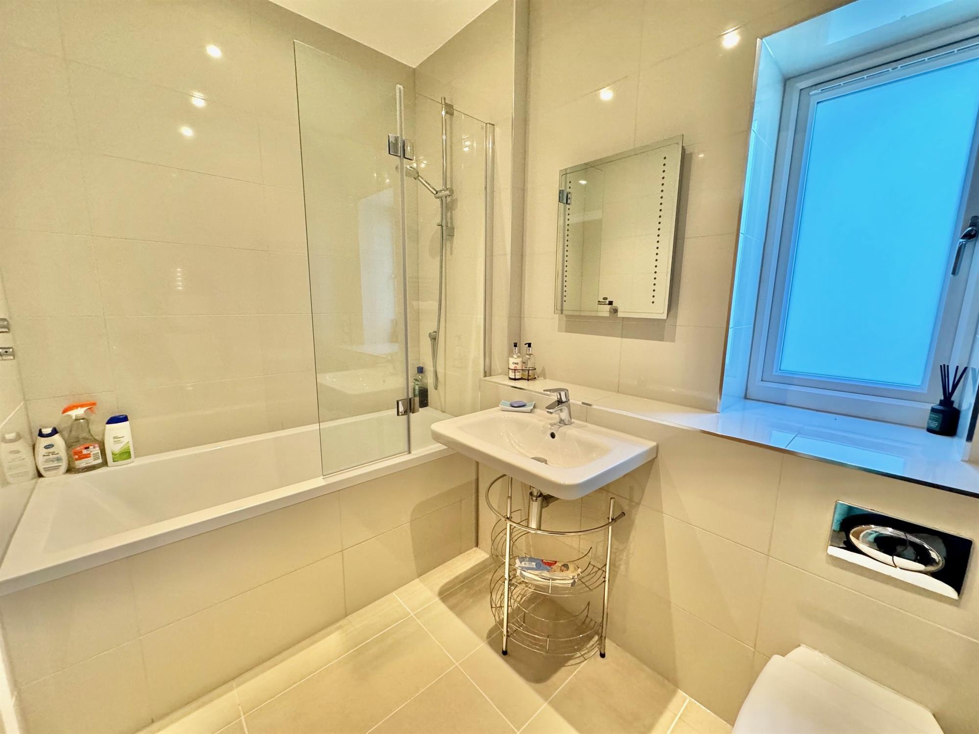 EN-SUITE BATHROOM 8' 8" (2.64m) x 5' 10" (1.78m)Tiled panelled bath in full tiled surround with mixer tap and built-in shower. Wall hung wash hand basin with mixer tap. Low level W.C. with enclosed flush. Walls in full tiled surround. Tiled floor. Opaque double glazed window to the front. Chrome runged radiator. Downlighters. Extractor fan. Backlit vanity mirror.