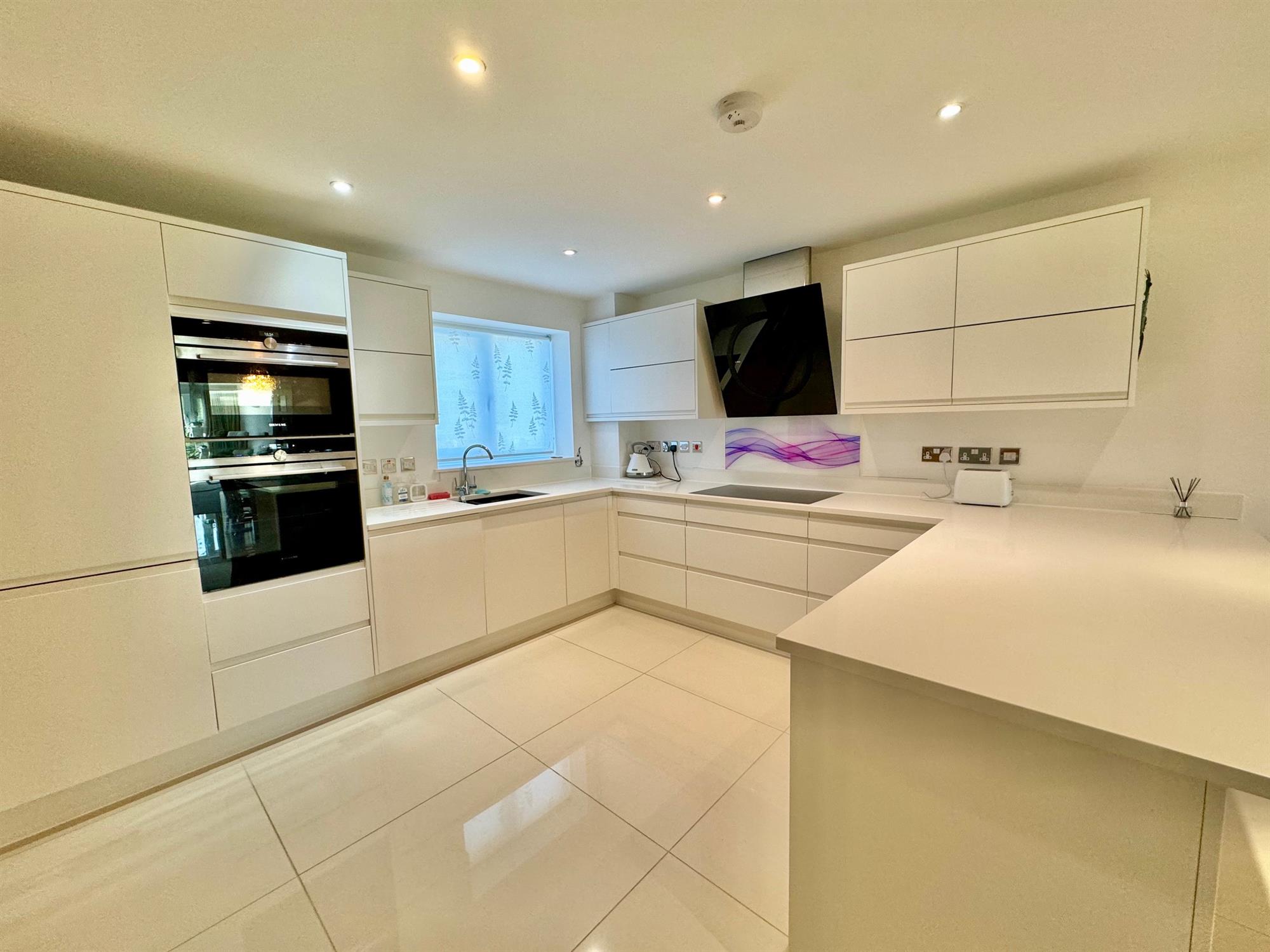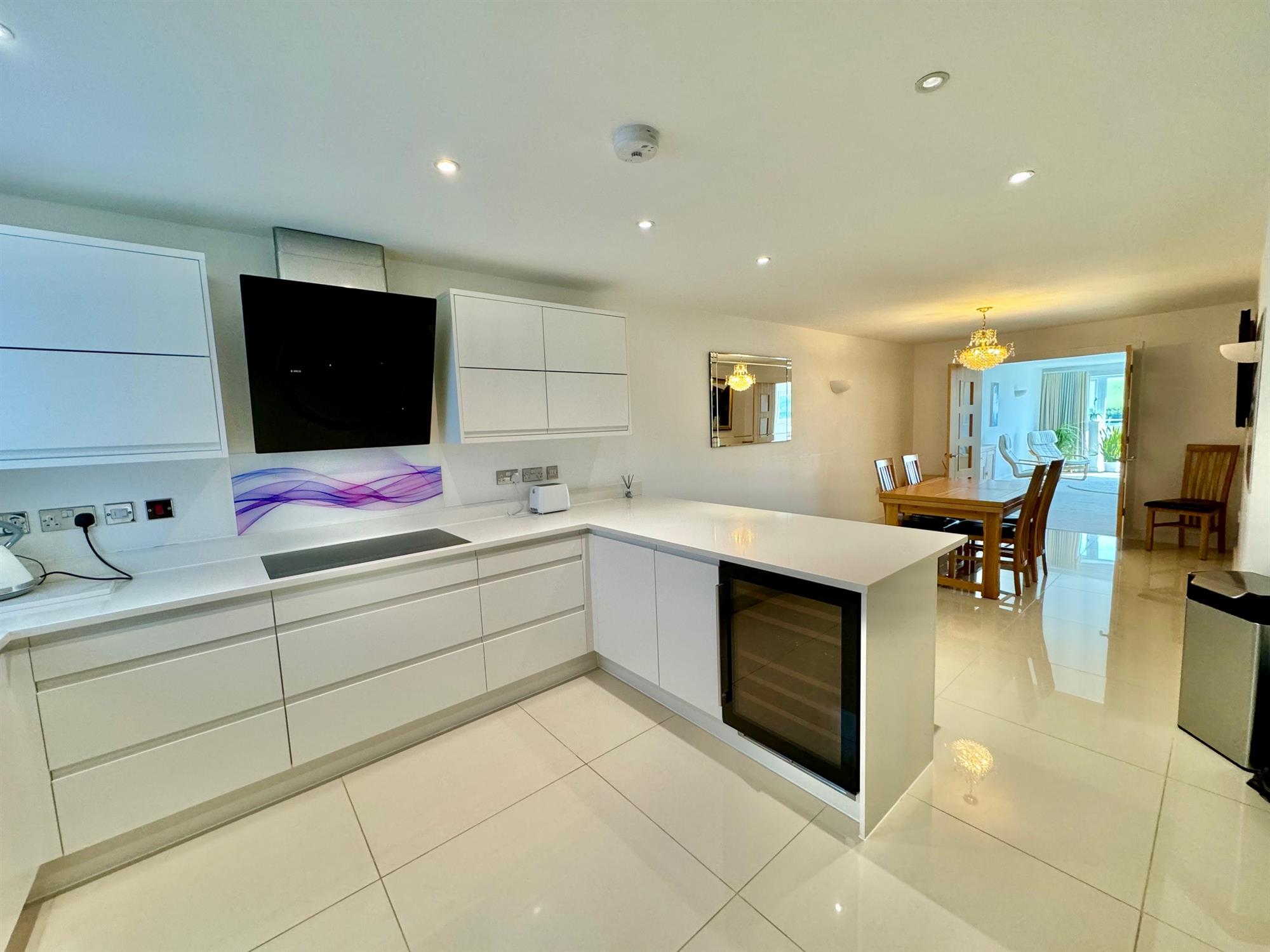 KITCHEN AREAQuartz white worktop surfaces with matching upstands. Inset 1½ bowl sink with drainer and mixer tap. Integrated Siemens five ring induction hob with extractor over and underlighting. White fronted cupboards and drawers under with integrated dishwasher, fridge freezer, microwave and full size wine cooler. Matching wall mounted cupboards with underlighting. Tiled floor with underfloor heating, which continues in the dining area.
