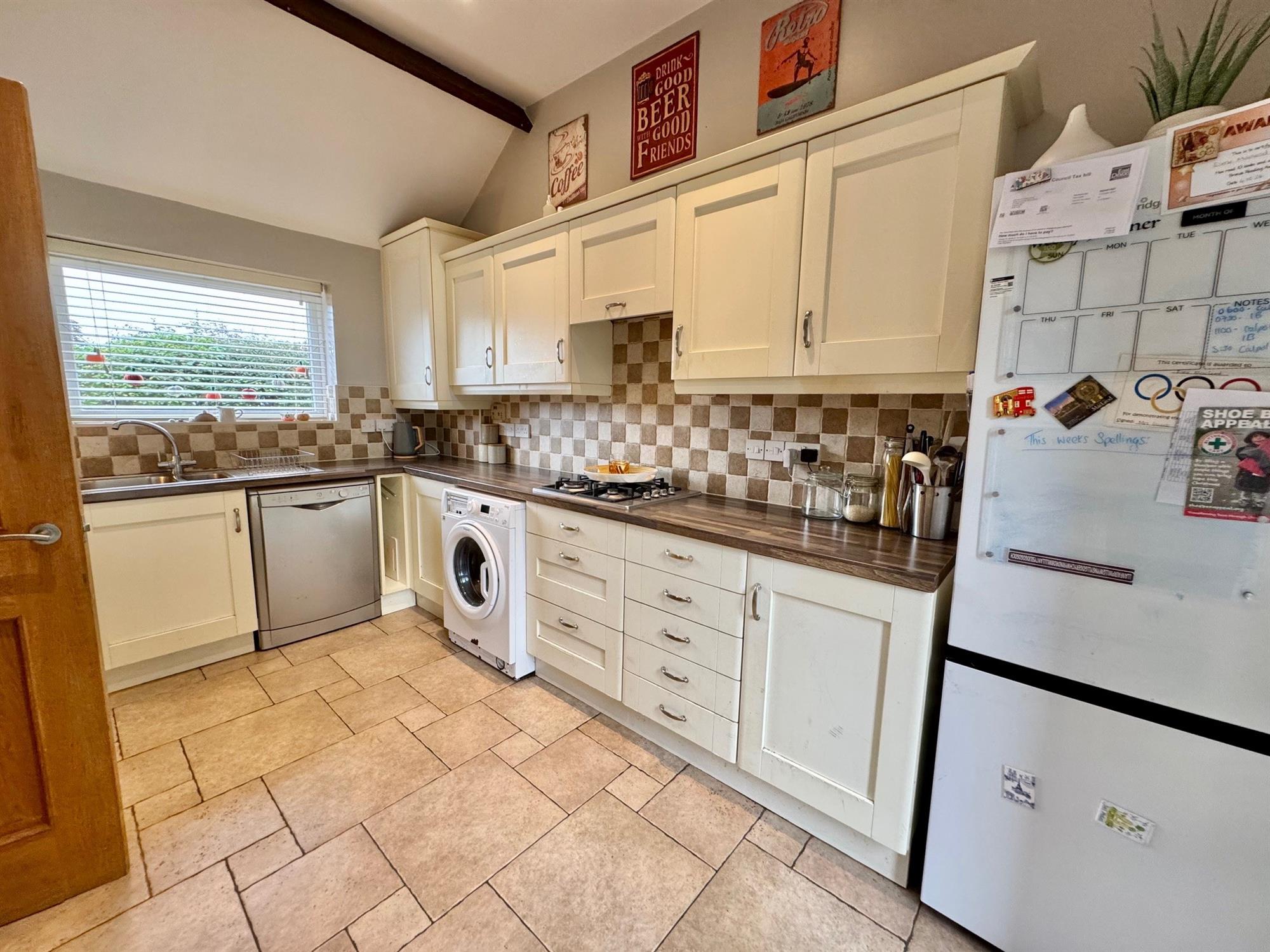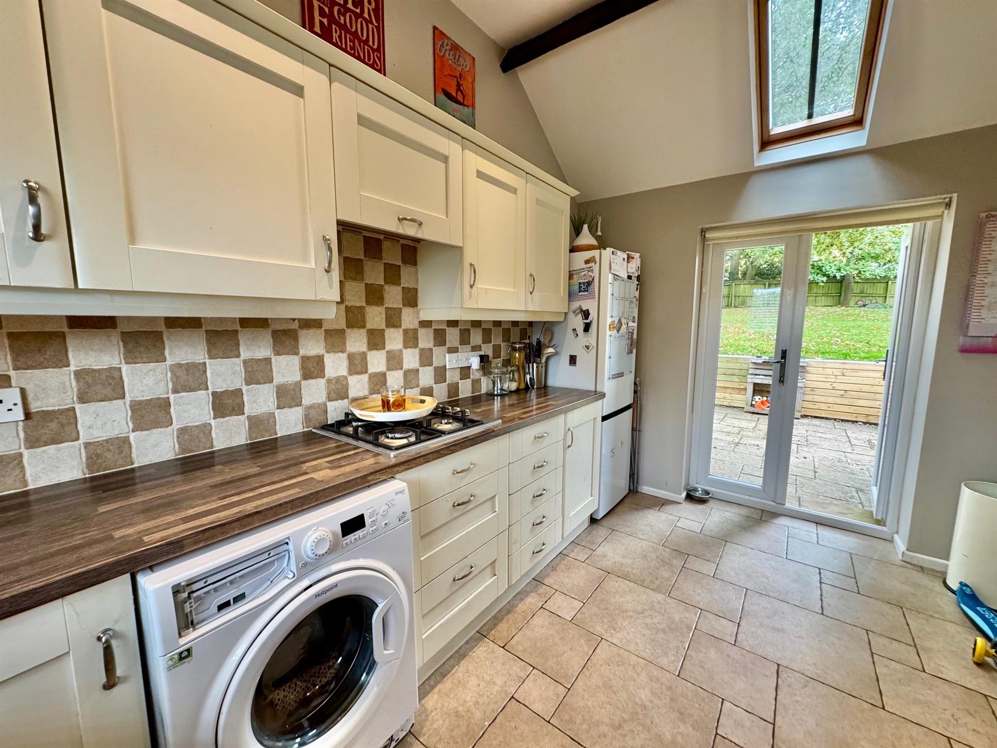 Wood effect worktop surfaces in tiled splash back with inset 1½ bowl stainless steel sink with drainer and mixer tap.4 Ring gas hob. Cupboards and drawers under with space for washing machine,fridge freezer and dishwasher. Matching wall mounted cupboards with built- in double oven. under lighting. Volted beamed ceiling with downlighters.Double glazed window to the front.Double glazed velux window to the rear with double glazed double doors leading out onto the rear garden.Tiled floor. Radiator.
