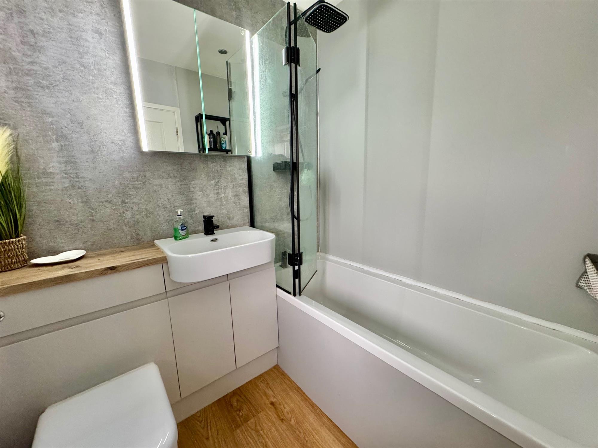 Opaque double glazed window to the front. Panelled bath with split fold glass screen with mixer tap and built in twin headed shower unit. Wash hand basin with mixer tap with cupboards under. Enclosed flush low level WC. Led lit mirrored medicine cabinet. Extractor fan.Downlighters. Chromed runged Radiator.