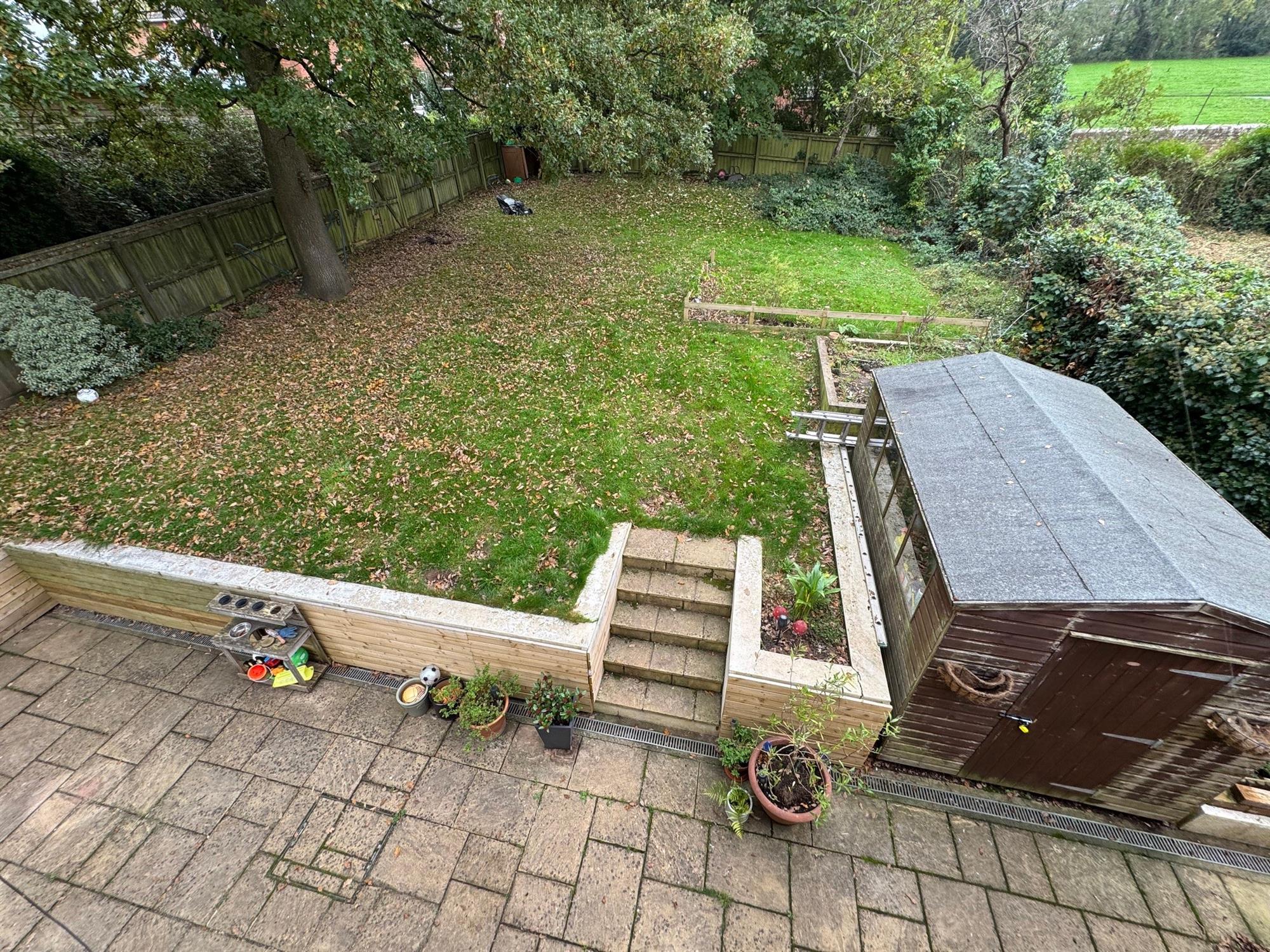 To the rear is a full width paved patio with access around to the side of the property. Five steps lead up to a very large lawned garden with a fence enclosure gated to the side. Thre is also one large oak tree a raised vegetable bed and a garden shed. The rear also overlooks the phear park golf course.