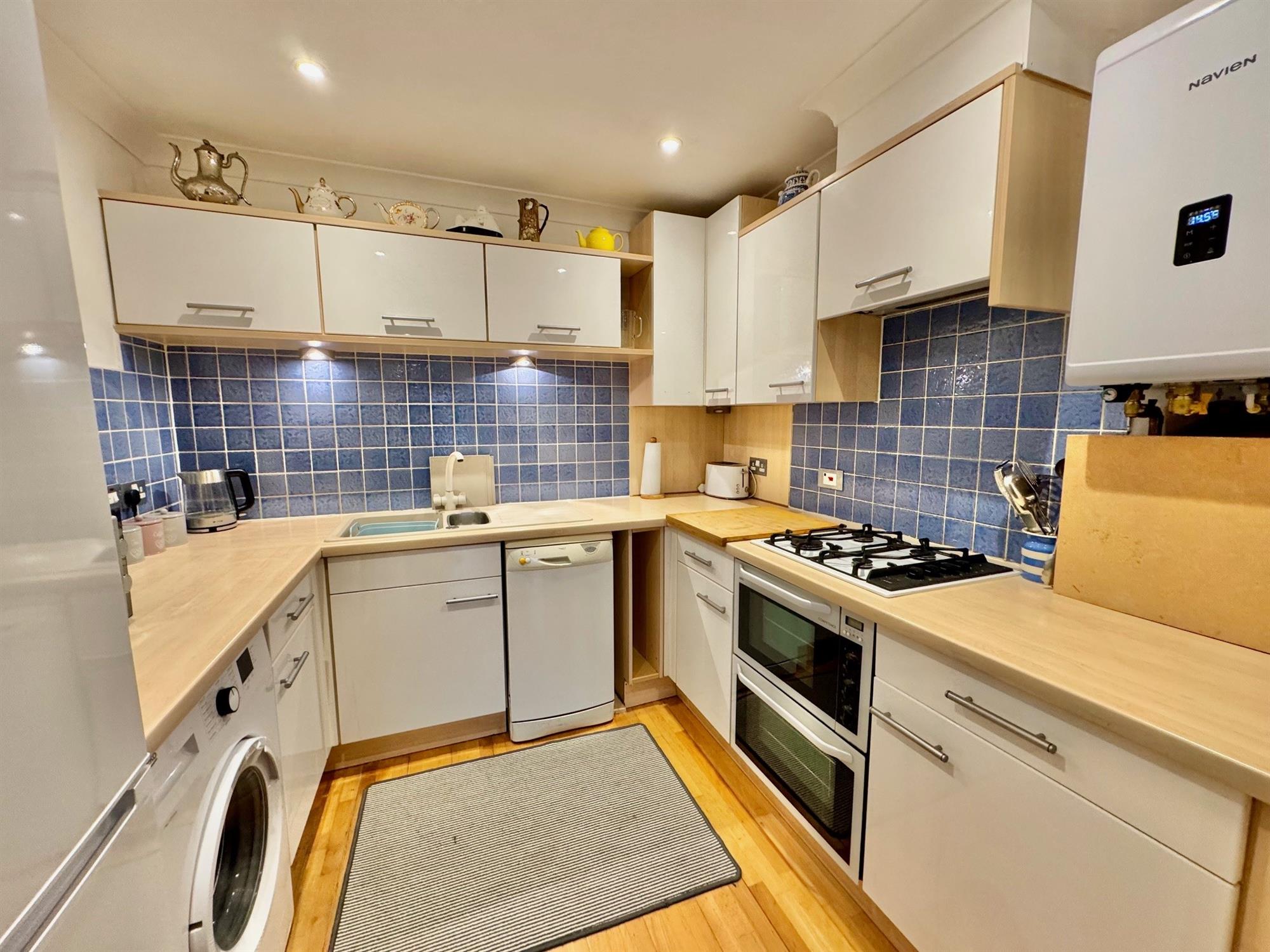 KITCHEN 8' 5" (2.57m) x 7' 9" (2.36m): Wood effect worktop surfaces in tiled splashback. Inset one and a half bowl sink with drainer and mixer tap. Inset four ring gas hob. White fronted cupboards and drawers under with space for washing machine and fridge freezer. Built-in double oven. Matching wall mounted cupboards with under-lighting and cooker hood. Wall mounted gas fired boiler. Coved ceiling. Downlighters. Wood flooring.
