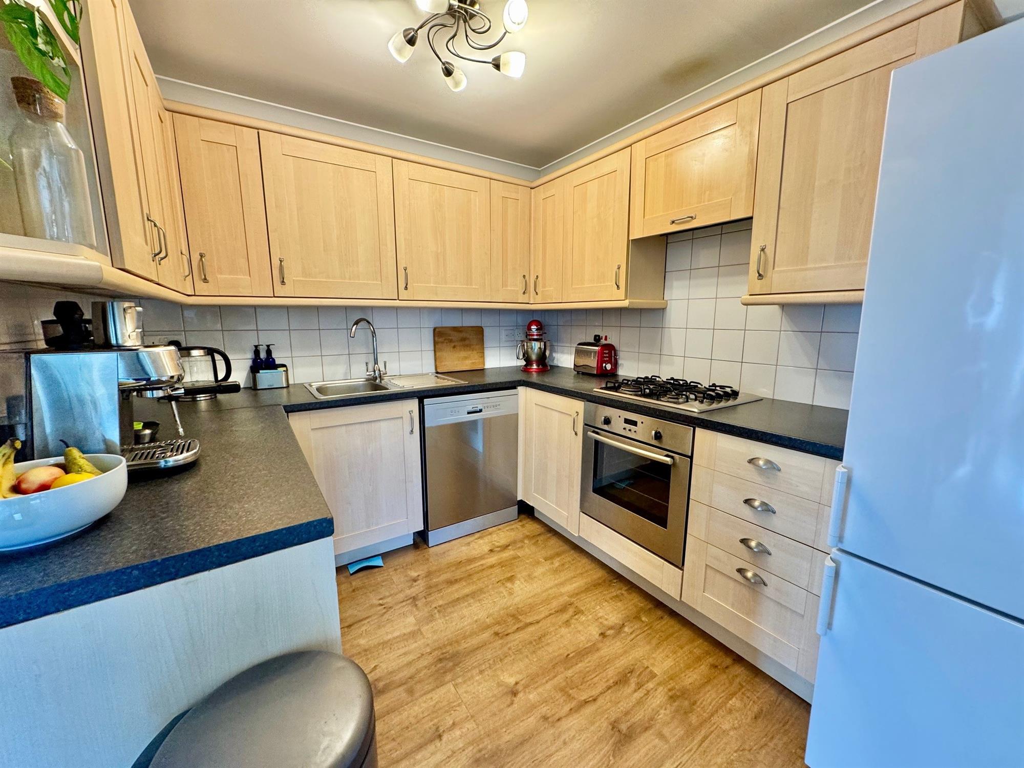 The kitchen comprises of roll edge worktop surfaces in tiled splash back with inset stainless steel sink with drainer and mixer tap. Four ring gas hob. Wood fronted cupboards and drawers under with integrated oven. Space for dishwasher, washing machine and fridge freezer. Matching wall mounted cupboards with cooker hood and under lighting. Corner display shelf. Coved ceiling. Wood effect laminate floor continuing from the hallway through to the sitting/dining room.