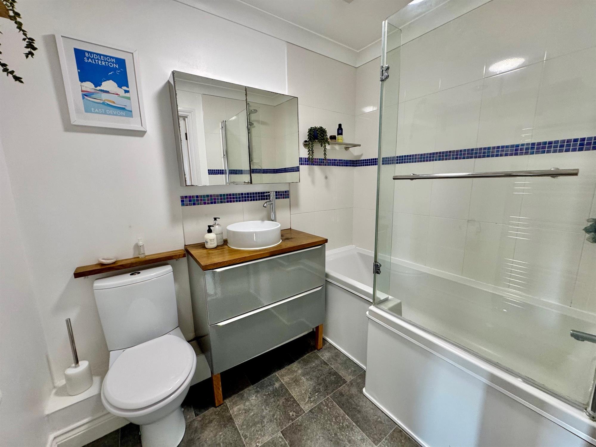 Modern white suite comprising a P-shaped bath in full tiled surround with mixer tap. Built-in shower with glass screen. Circular wash hand basin with mixer tap sat in a vanity unit with cupboards under with tiled splash back. Low level WC. Chrome runged radiator. Coved ceiling. Extractor fan.