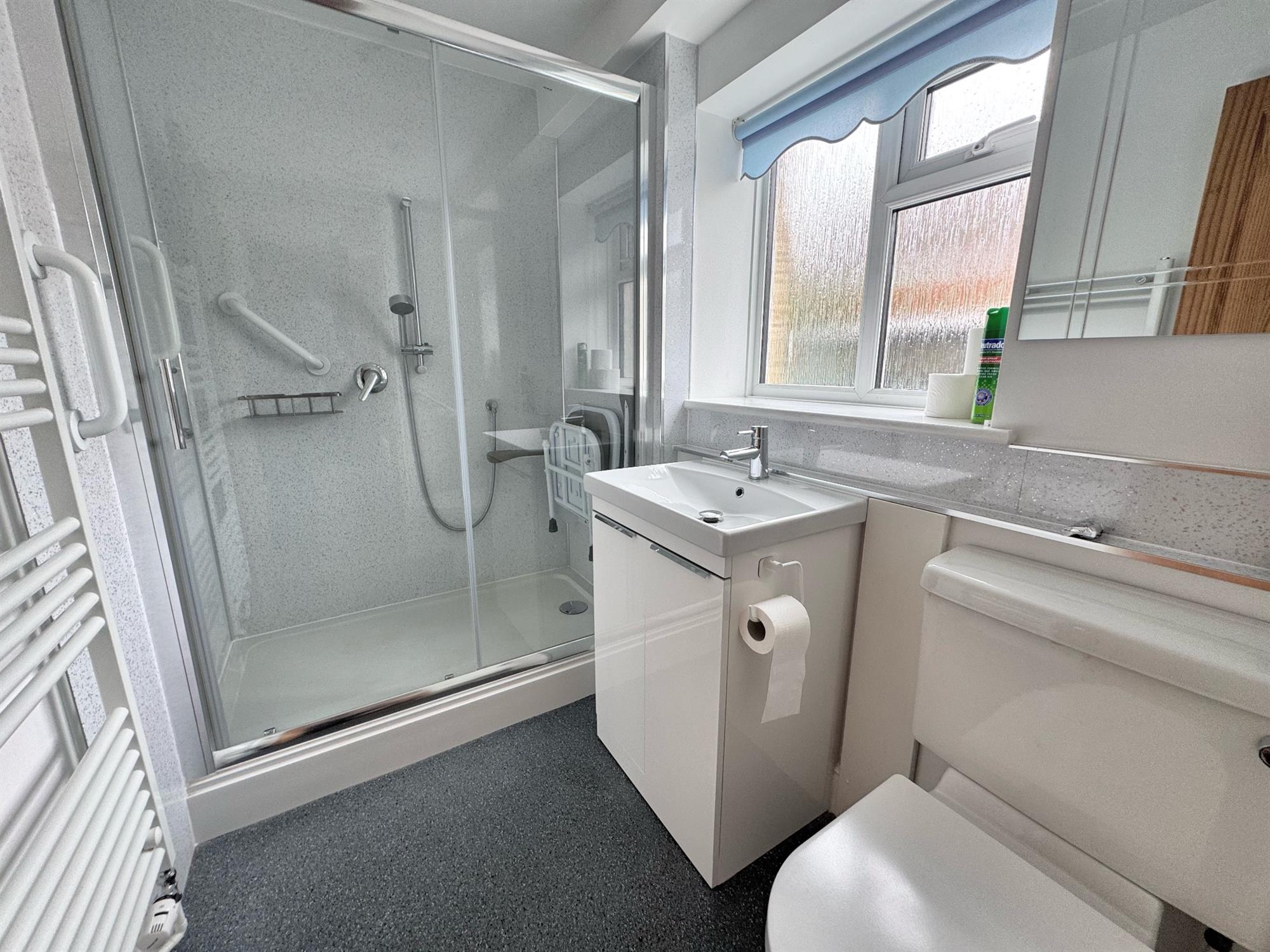 SHOWER ROOM 7' 10" (2.39m) x 5' 3" (1.60m): Modern white suite comprising - Low level WC. Wash hand basin with mixer tap with cupboards under. Double shower cubicle with built-in shower and sliding glass door. White runged radiator. Opaque double glazed window to front.