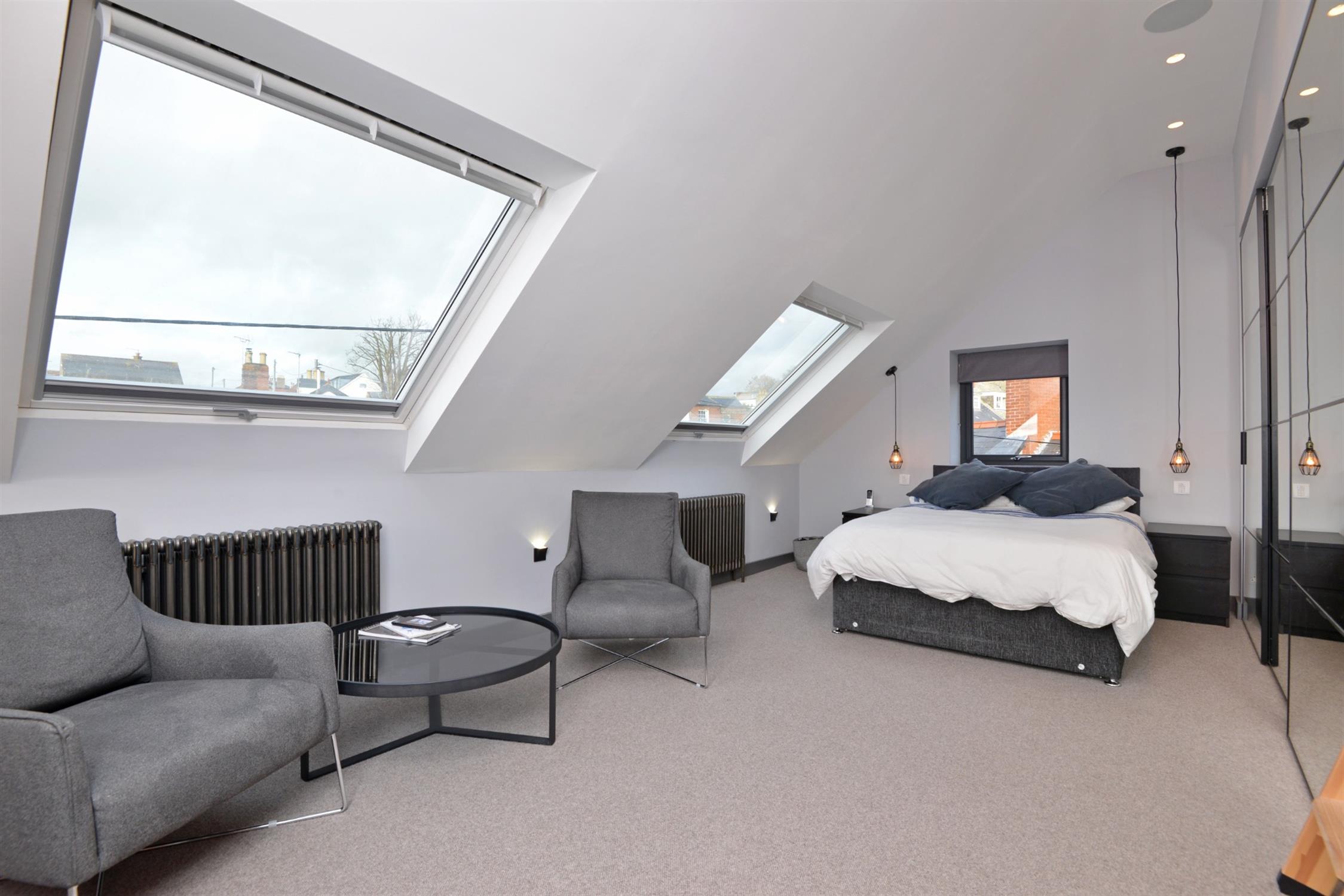 BEDROOM 3 14' (4.27m) x 13' 9" (4.19m) A lovely bright room with two large roof windows and a feature window to the side looking along The Strand towards Peter’s Tower. Range of fitted cupboards with mirrored doors; one with concealed ladder which leads up to:-