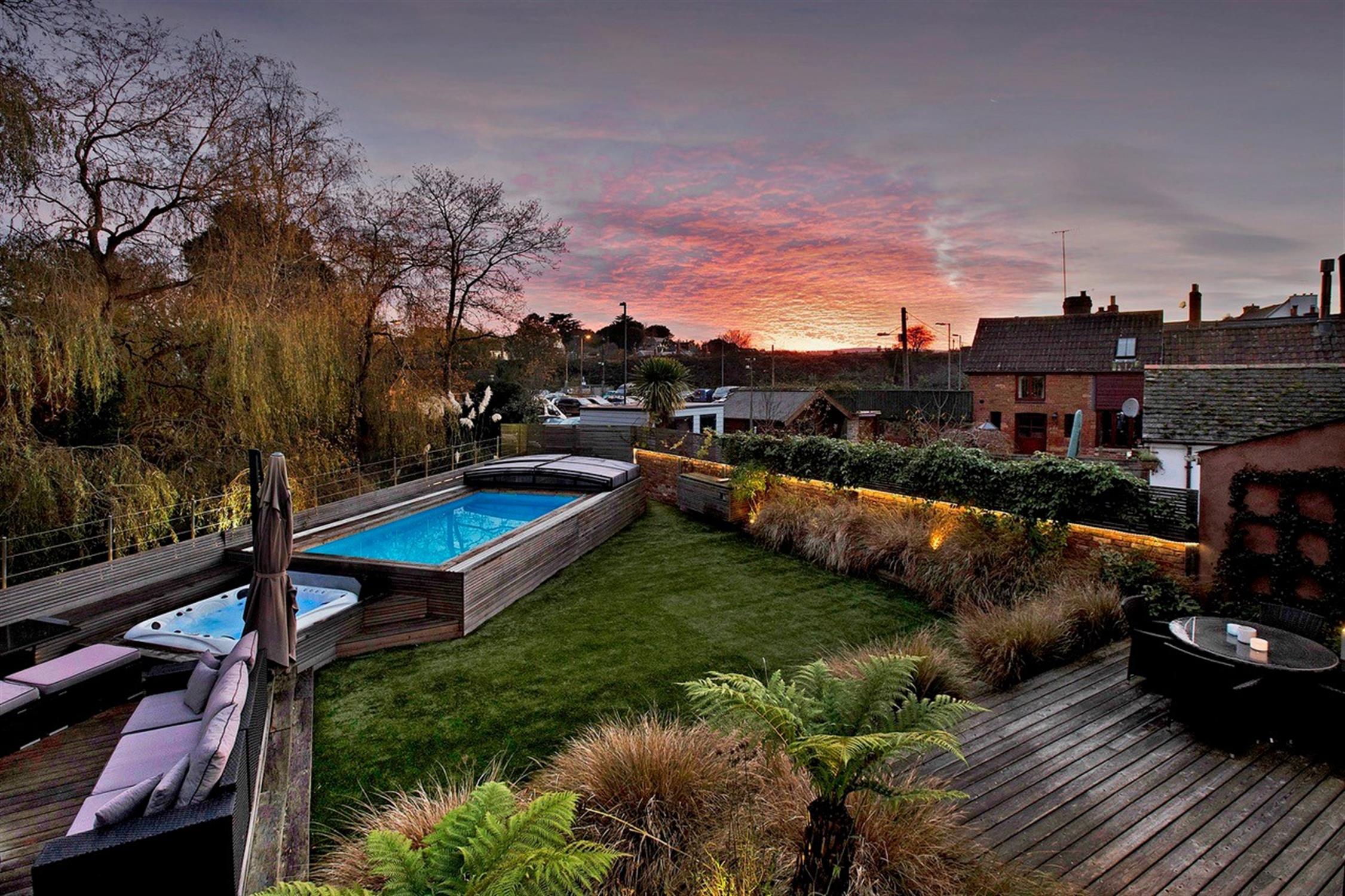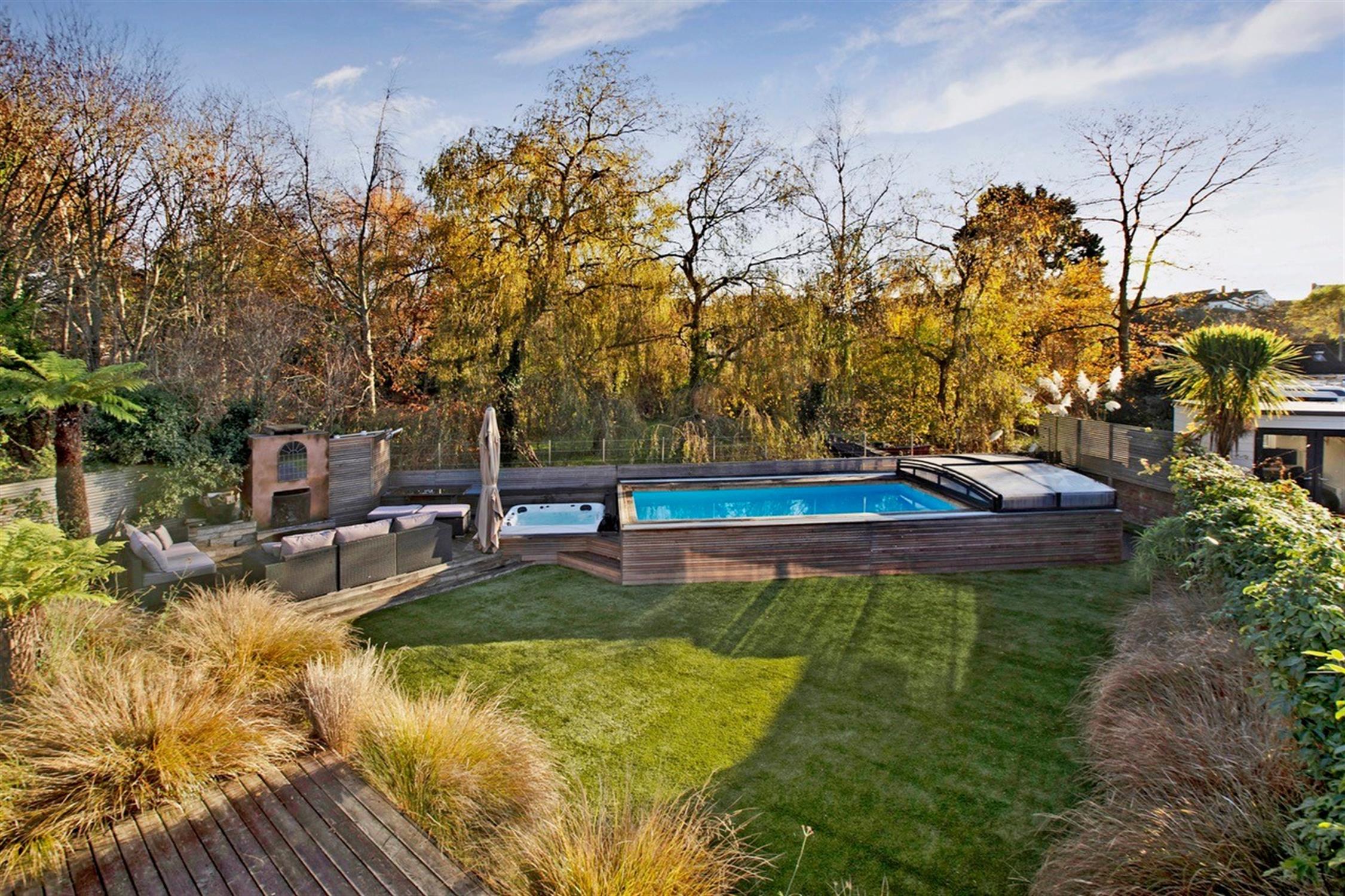 HEATED SWIMMING POOL with a retractable glass cover offers year-round enjoyment, complemented by a good-sized area of artificial lawn, a trampoline and a useful garden shed for storage. The rear boundary of the garden runs alongside Wotton Brook, adding a tranquil natural element.