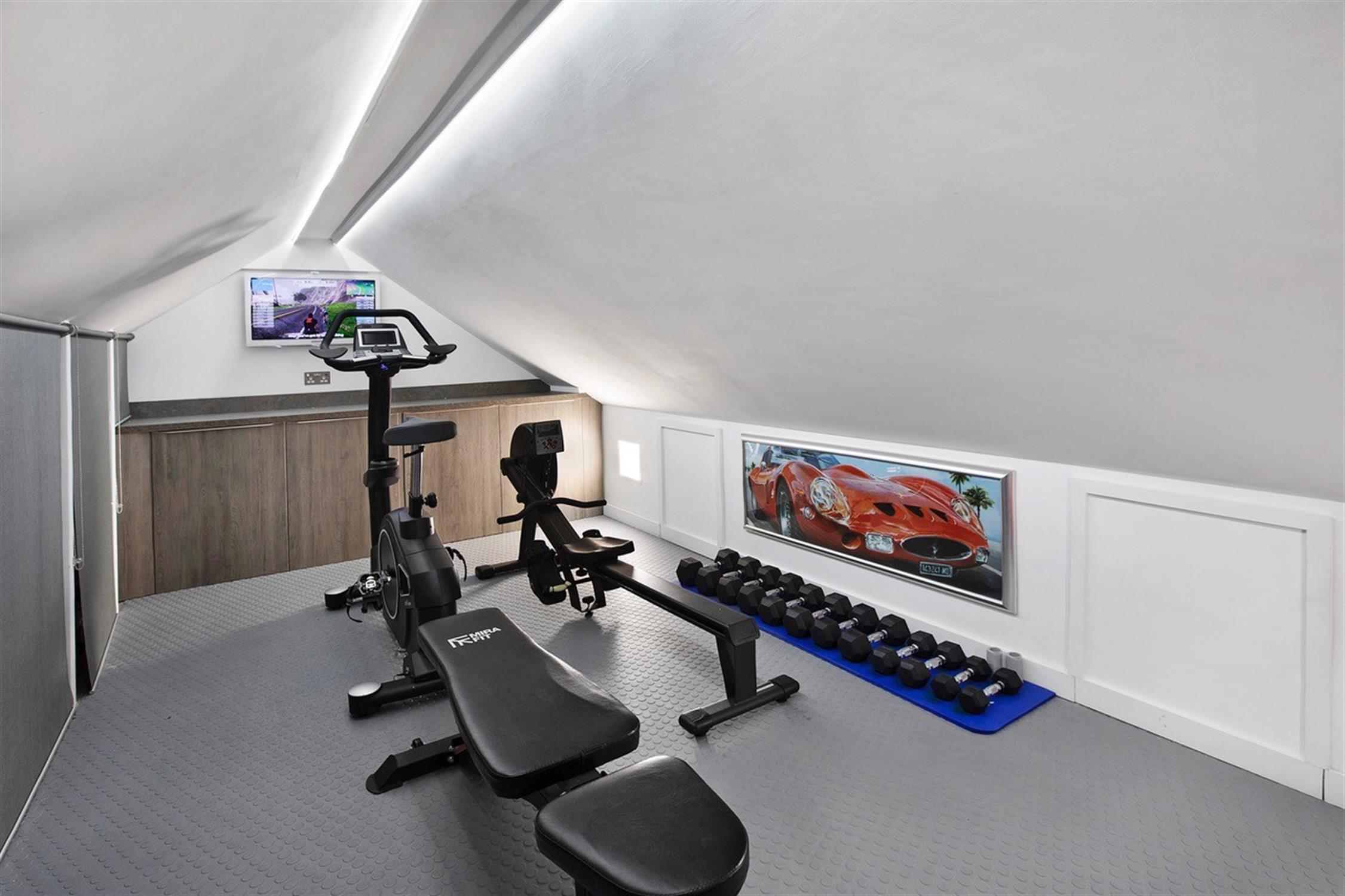 FIRST FLOOR HOME GYM 17' 11" (5.46m) x 11' 6" (3.51m) Equipped with air conditioning and fitted storage.