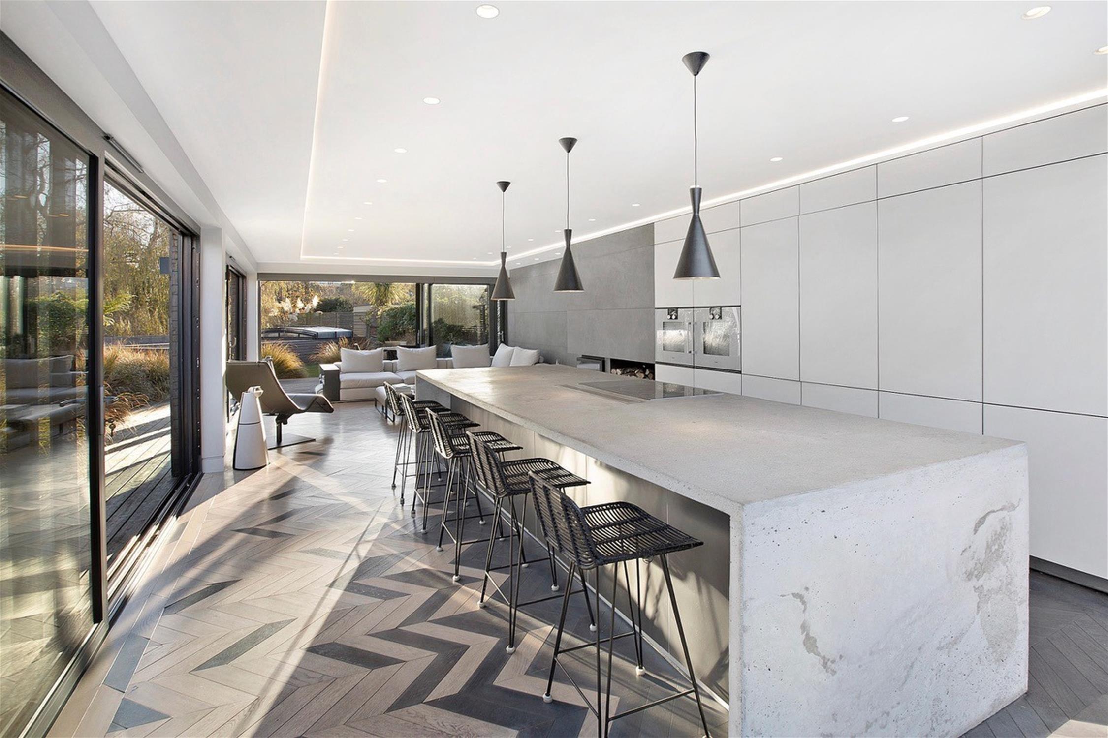 KITCHEN/BREAKFAST/FAMILY ROOM 36' 8" (11.18m) x 15' 7" (4.75m) This open-plan living space has been thoughtfully designed to maximise the connection with the garden, featuring floor-to-ceiling glazing and three sets of sliding doors. Range of fitted cupboards and drawers. Bespoke polished concrete island housing oak-lined drawers. Induction hob with integrated extractor. Further fitted dishwasher. High-spec Bulthaup cabinetry includes a hidden sink unit and ample storage, complemented by a built-in fridge and two Gaggenau self-cleaning ovens. The room also features a fitted wood-burning stove and stylish bespoke parquet flooring.