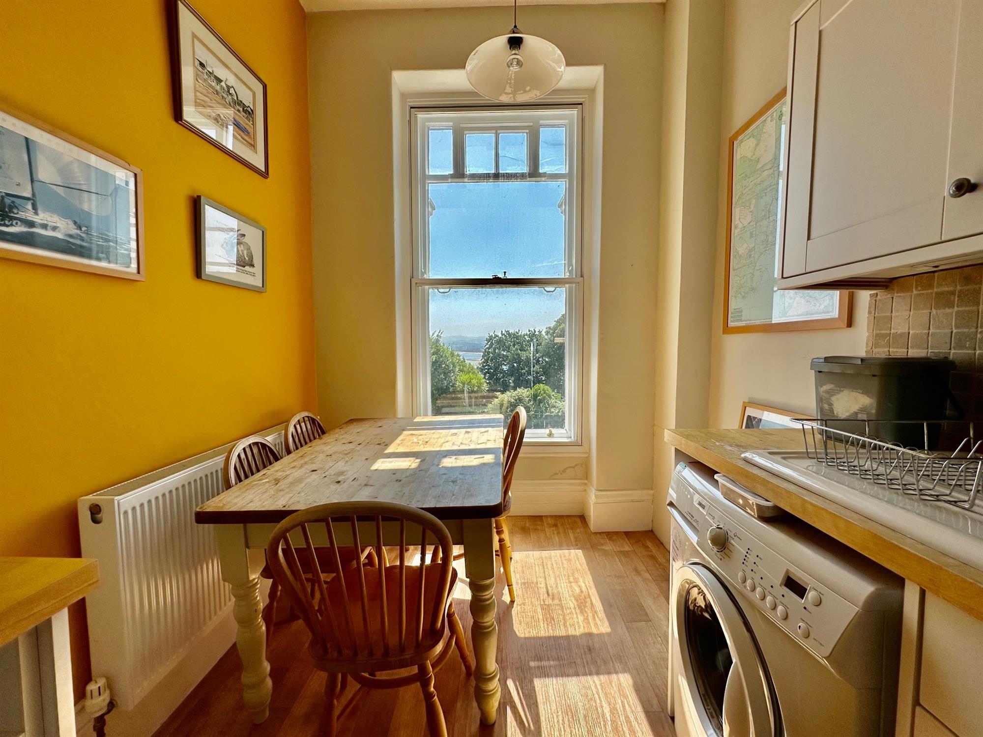 The apartment overlooks a nice green area to trees and the sea beyond. Located on the first floor both the apartment and store/office are accessed from the communal landing. The store/office has a fitted bench and houses the energy efficient condensing boiler. The front door to the apartment leads to a reception hall with an airing cupboard and doors to all of the rooms. The generous size sitting room/ dining area is a real feature having a wood burning stove and a large bay window enjoying sea views. The modern kitchen/breakfast room enjoys a similar outlook and has a built-in gas hob and fan assisted oven/grill. There are two well proportioned bedrooms with the largest one overlooking Holy Trinity Church to the rear. The other bedroom has internal windows. Finally, there is a good size bathroom/w.c. with a shower over the bath. Other features include gas central heating, secondary double glazing, shared rear courtyard and an outside store.