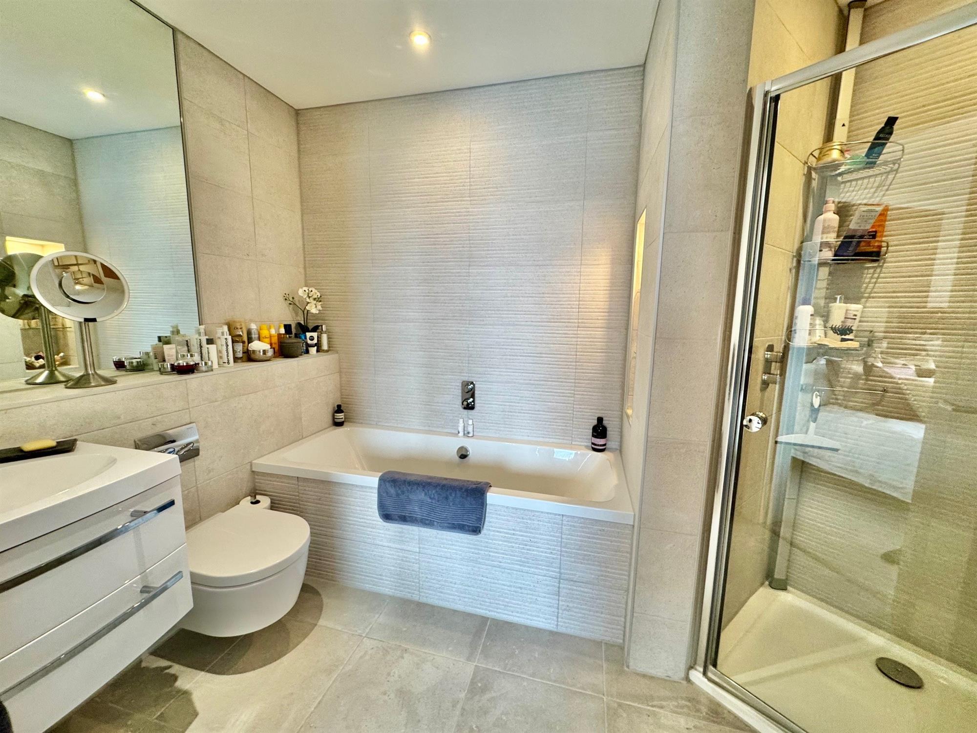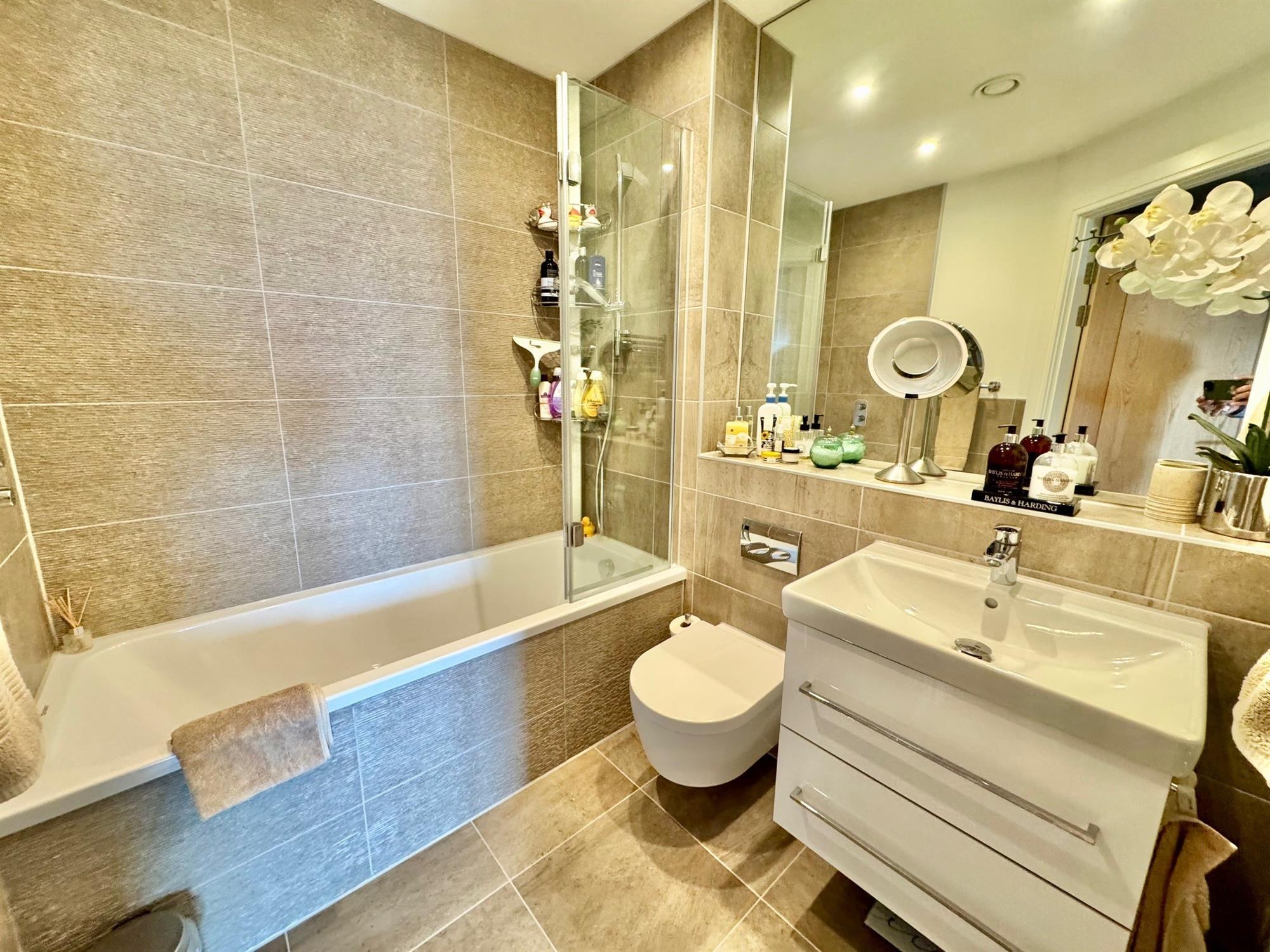 EN-SUITE BATHROOMA modern white suite comprising tiled panelled bath with central mixer tap. Enclosed low level W.C. Wash hand basin with mixer tap and cupboards under. Large fitted vanity mirror and tiled shelf. Fully tiled shower cubicle with built-in twin headed shower and glass door. Chrome runged radiator. Tiled floor with underfloor heating. Downlighters.
