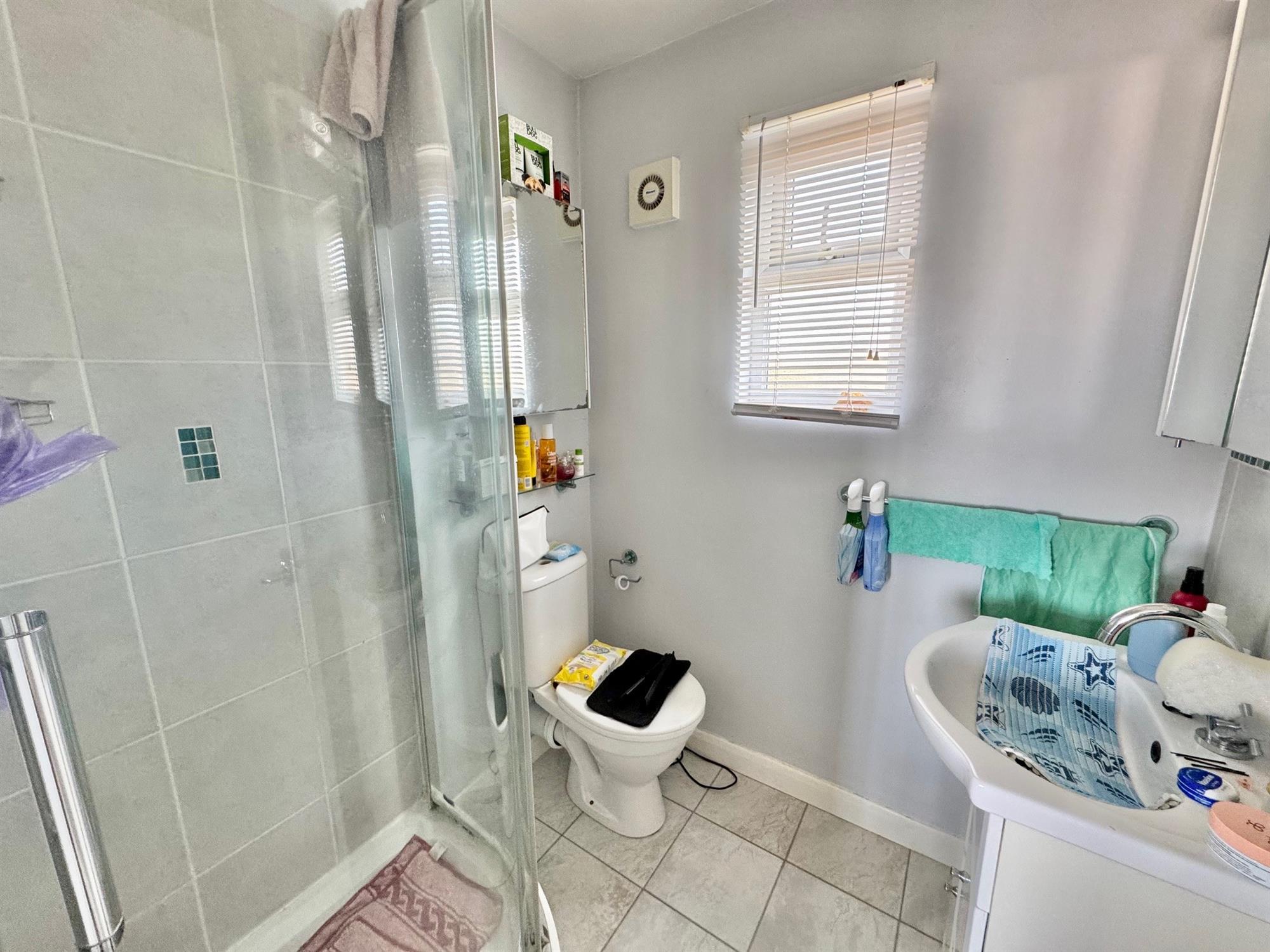EN-SUITE. Corner shower cubicle in full tiled surround with built-in shower. Low level WC. Wash hand basin with tiled splashback and cupboards under. Fitted mirrored medicine cabinet with lighting. Opaque double glazed window to front. Extractor fan. Chrome runged radiator.