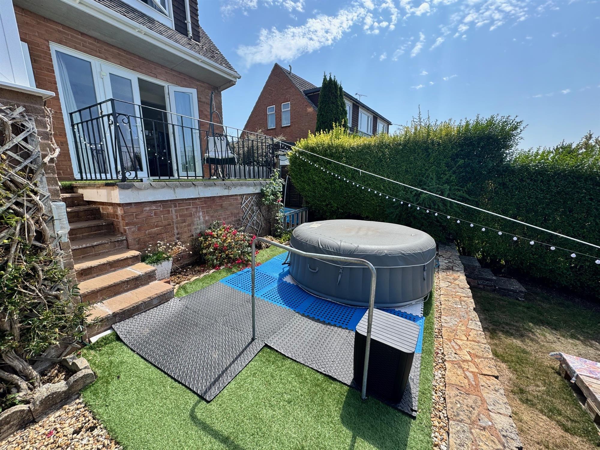 BALCONY that comes off of the sitting room with a few steps down to a level gravelled area. From here three steps lead down to a lawned garden, all with a fence and hedge enclosure. There is also timber built