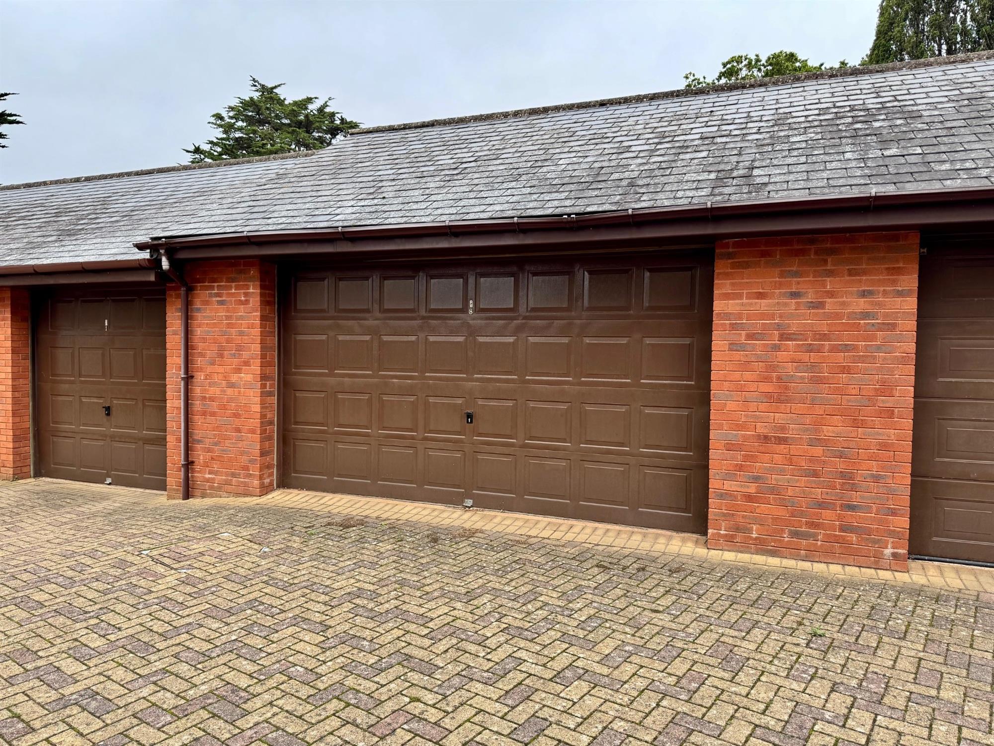 Electric up and over door. There is a parking space in front of the garage.