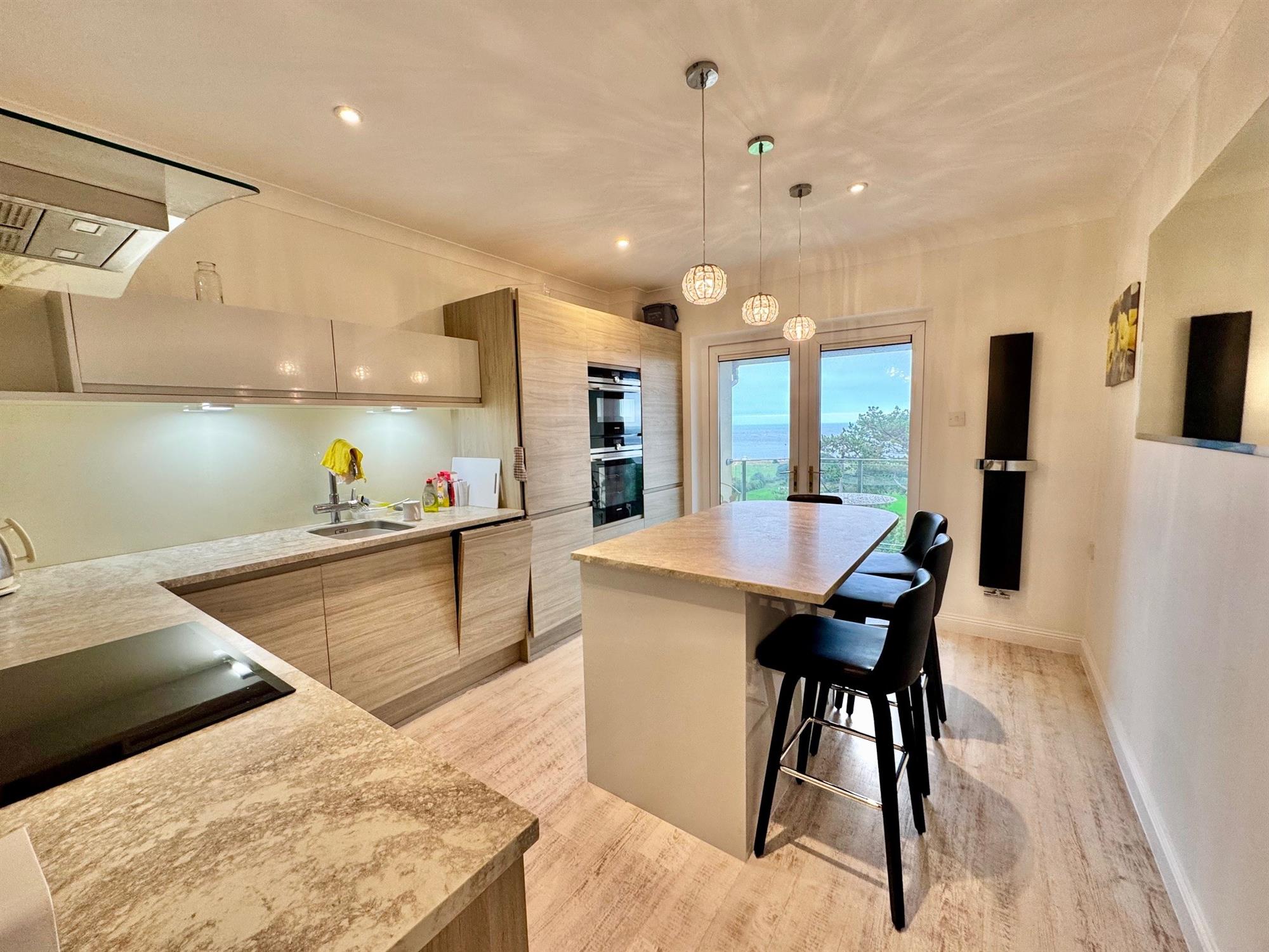 uPVC double glazed double doors lead onto the private balcony with stunning views across the coastline beyond. Modern fitted kitchen comprising:- stone worktop surfaces with inset stainless steel sink with mixer tap. Grooved drainer. Grohe hot water system. Siemens built-in induction four ring hob. Cupboards and drawers under with integrated corner carousel unit. Slimline dishwasher. Fridge freezer. Two Siemens built-in ovens. Matching breakfast bar with storage under. Siemens stainless steel and glass extractor. Coved ceiling. Downlighters. Radiator.