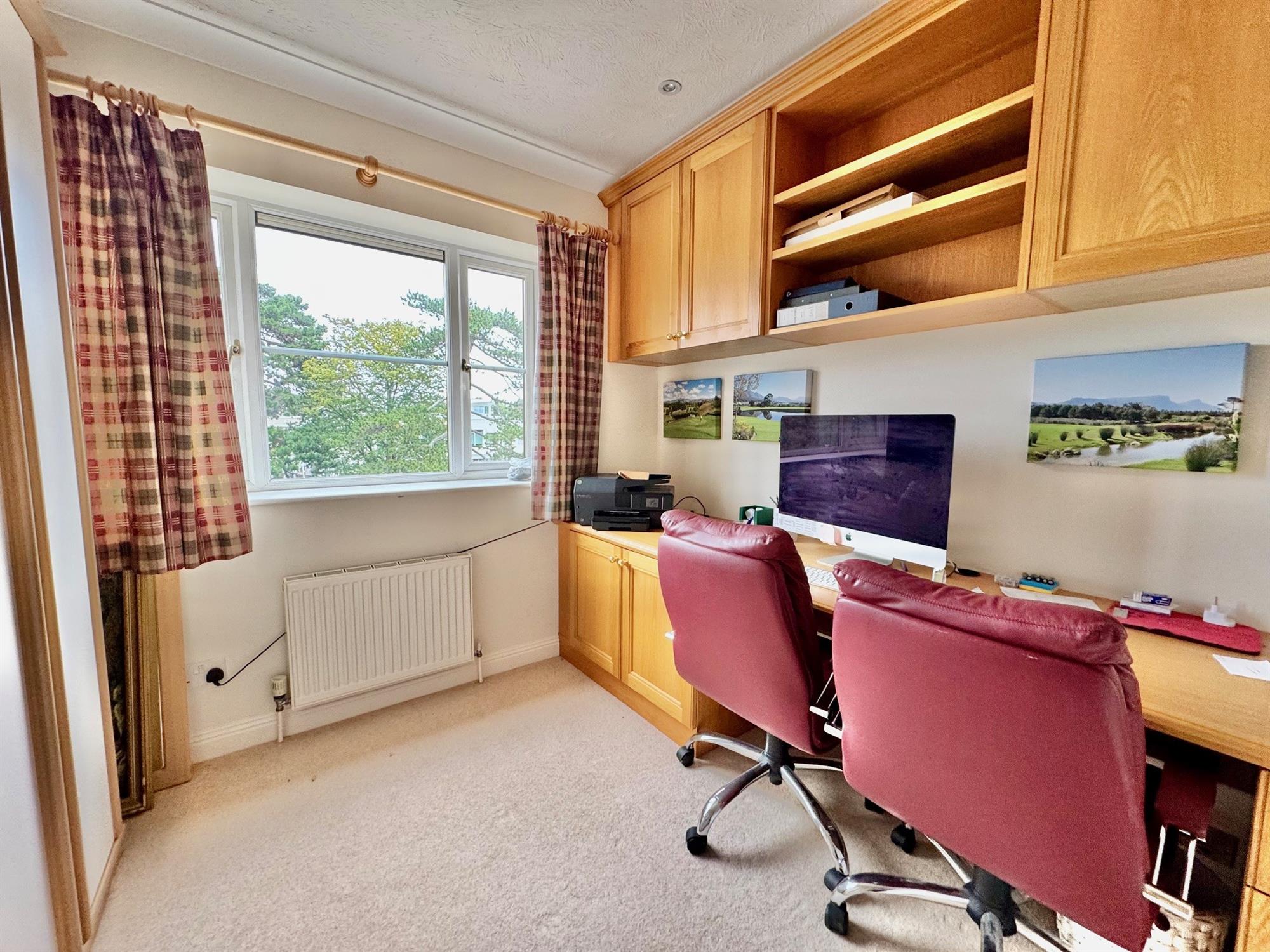 Double glazed window to the rear. Fitted desk unit with cupboards under. Matching wall mounted cupboards with shelving. Radiator. Coved ceiling. Downlighters.