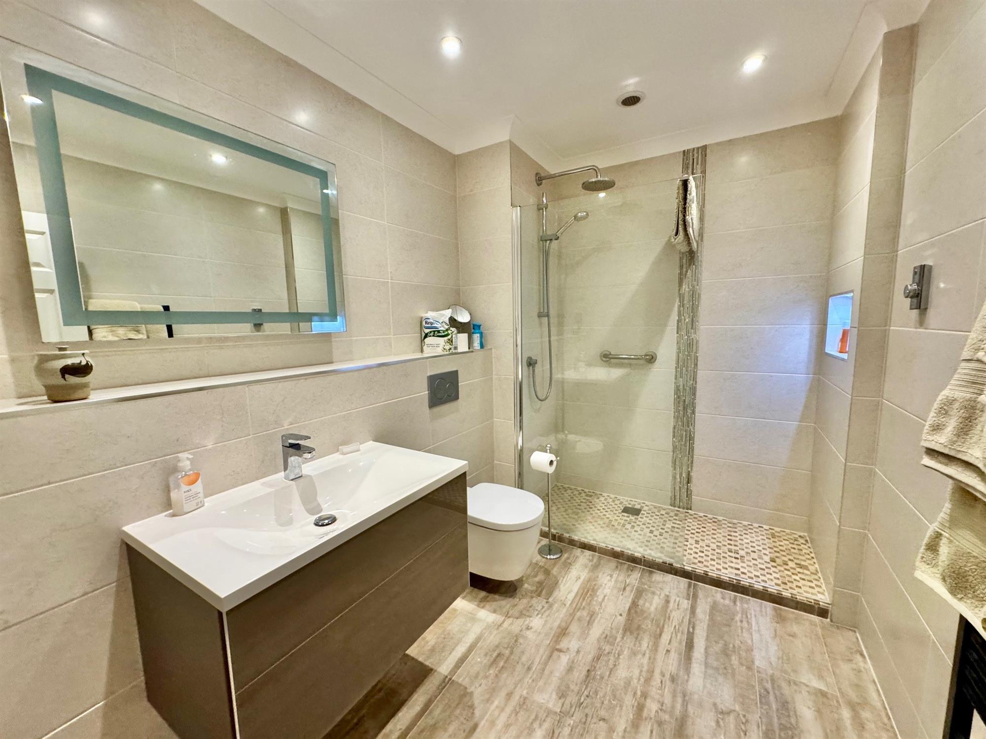 Modern shower room comprising:- stoned floored walk-in shower cubicle in full tiled surround with built-in twin headed shower with remote control. Enclosed flush low level W.C. Wash hand basin with cupboards under. Walls in full tiled surround. Backlit mirror. Shaver point. Tiled floor with underfloor heating. Black runged radiator. Downlighters. Coved ceiling. Extractor fan.