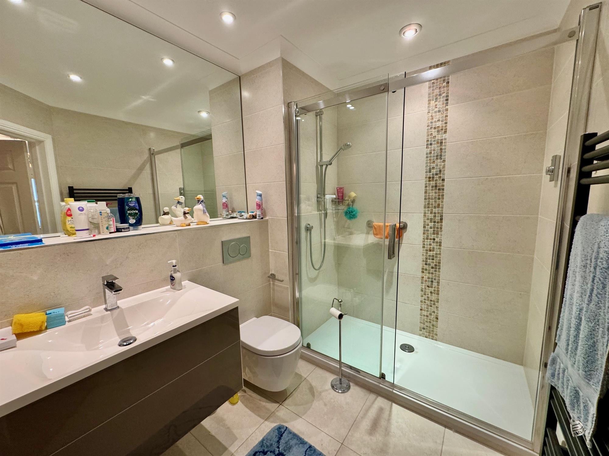 A modern white suite comprising:- large walk-in shower in full tiled surround with sliding glass door. Built-in remote accessed shower. Enclosed flush low level W.C. Wash hand basin with mixer tap and cupboards under. Walls in full tiled surround. Tiled floor. Large vanity mirror. Coved ceiling. Downlighters. Black runged radiator. Extractor fan.