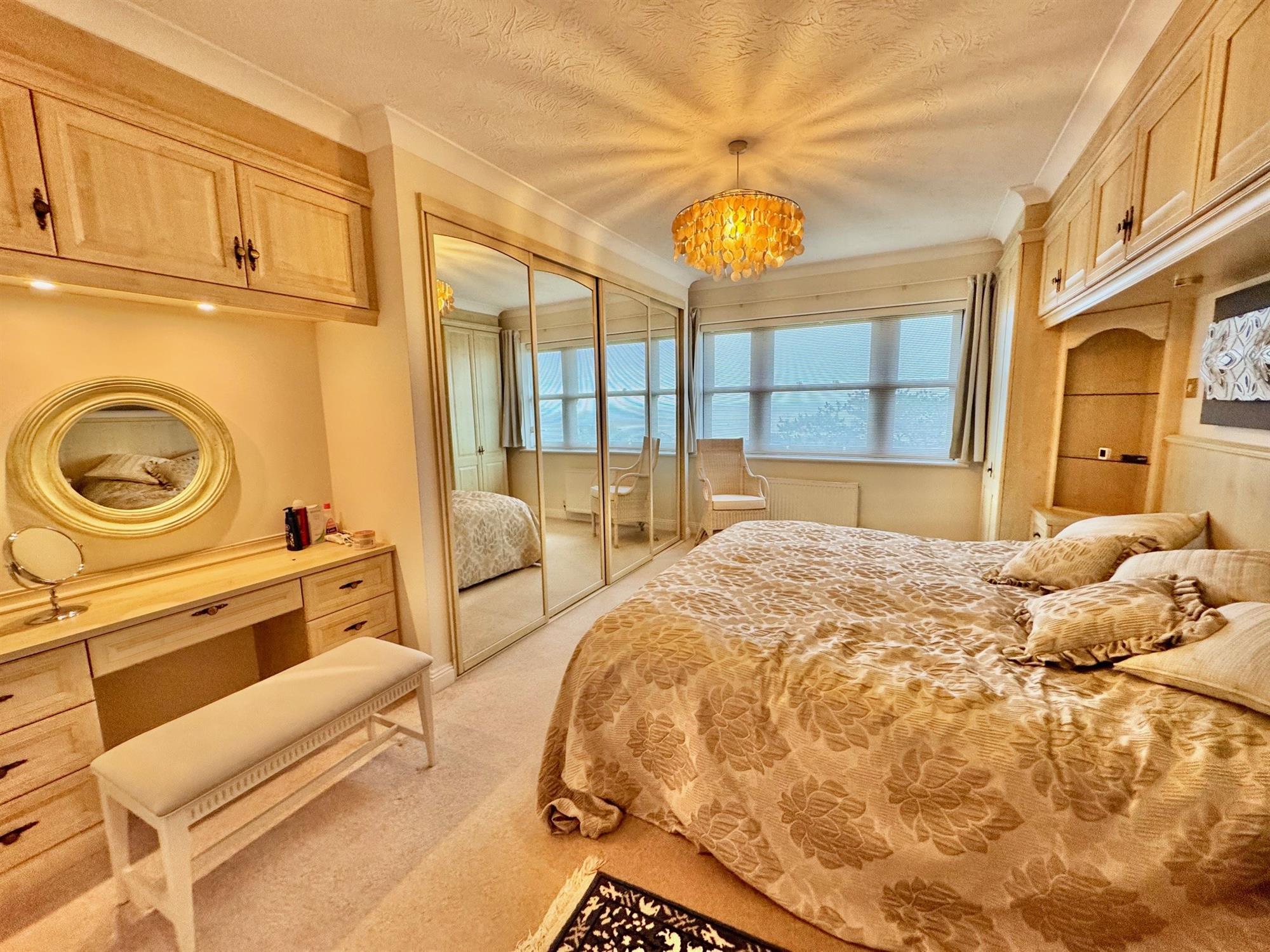 uPVC double glazed window to the rear overlooking the communal gardens and coastline beyond. Range of fitted wardrobes to include a four door mirrored sliding wardrobe. Dressing table with cupboards above. Radiator. Coved ceiling. Door to:-