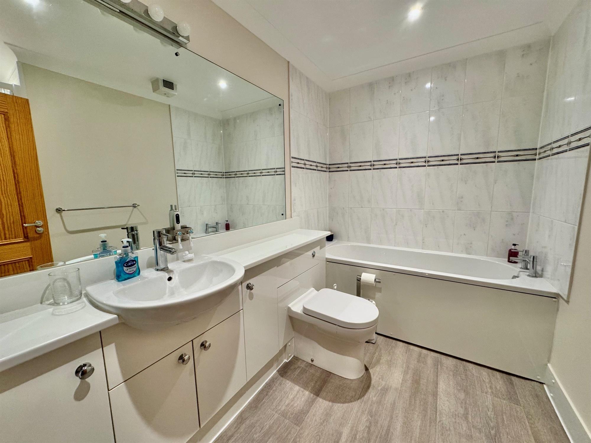 Modern white suite comprising panelled bath with mixer tap in tiled surround. Low level WC. Wash hand basin with mixer tap and cupboards under. Heated mirrored splashback with shaver point. Shower cubicle with electric shower. Chrome runged radiator. Shaver point. Fitted storage cupboards. Coved ceiling. Downlighter.