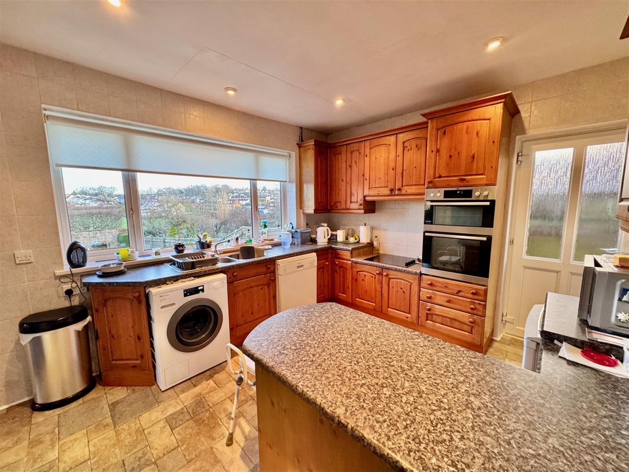 Double glazed window to the rear overlooking the fields. Double glazed opaque door to the side. The kitchen comprises granite effect worktop surfaces in tiled splashback with inset 1½ bowl sink with drainer and mixer tap. Ceramic electric hob. Wood fronted cupboards and drawers under with space for washing machine, dishwasher and fridge. Built-in AEG double oven. Extractor fan. Matching wall mounted cupboards. Central breakfast bar. Down lighters. Radiator.